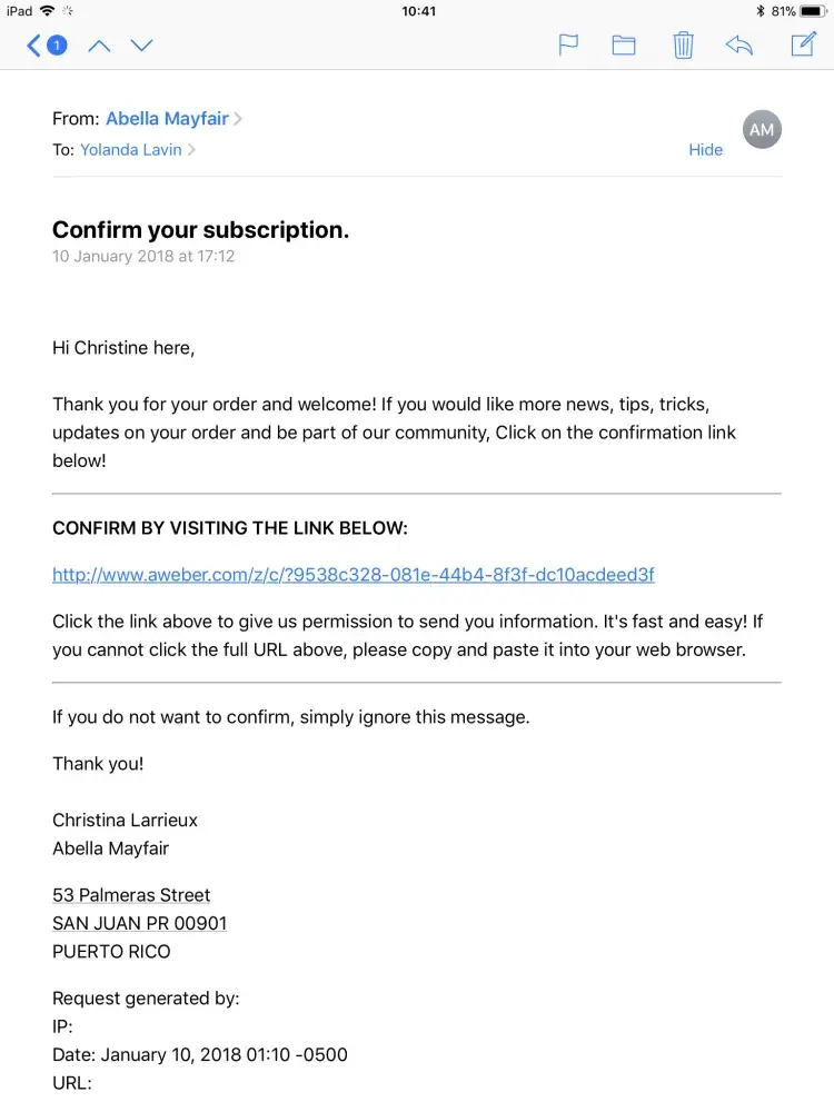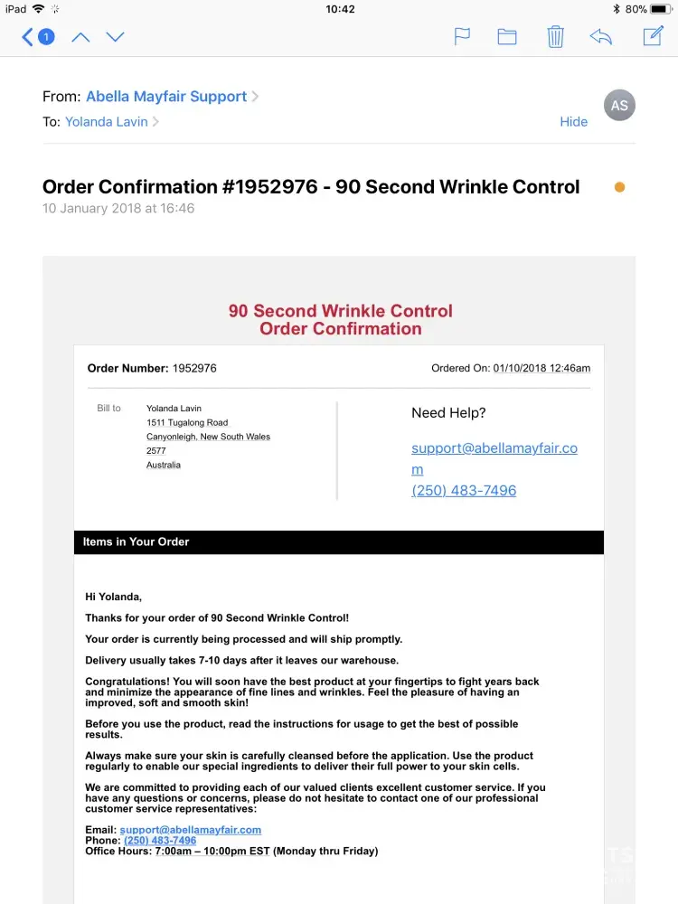 I received an online offer from Abella Mayfair to try a free sample of face cream and agreed on Jan 4 2018 to pay the postage only A$5.19. I received the sample on Jan 19.