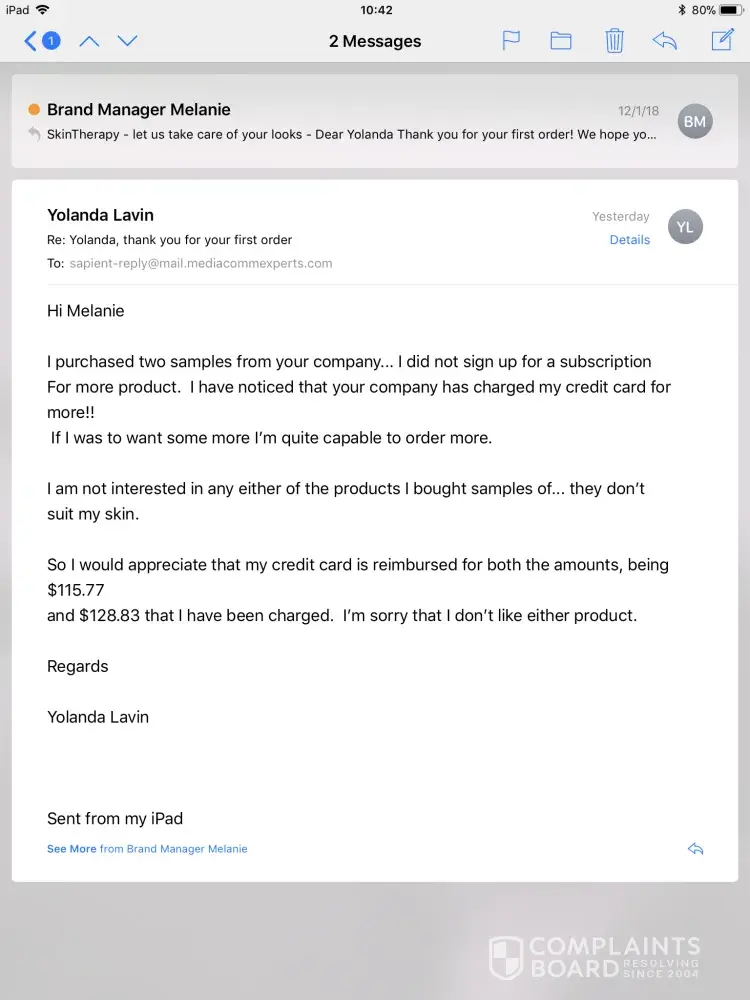 I called my credit card bank to complaine but was told to get in touch with the company so I sent an email to Abella Mayfair and complained they said that it was a 14 day trial and I didn't return the products and so agreed to purchase theses products at full price . T