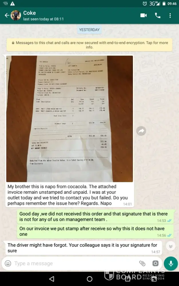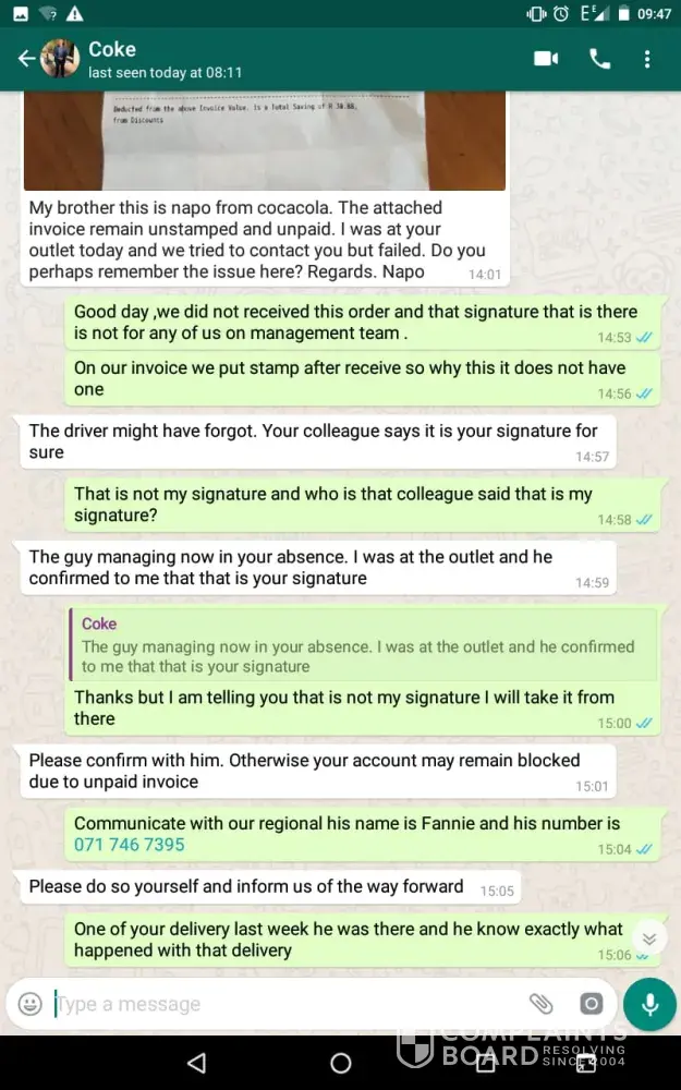 My name is Godfery(Hungry lion branch manager)Please note the guy from ABI IBT department by the name of Napo he send me wattsapp regard to the invoice that i did report previously that we did not received it and that signature on that invoice is not for one of us on management team and the guy he claimed that i must know what happened with that order otherwise they gonna blocked our account, this morning the guy came in our store and accused me of stealing those coldrinks and he will pay for it that is totally unacceptable for someone to accused me for something i dont know he was even swearing at me, could you address this matter with their head department so it can be resolved, that is not how the client must be treated honestly the guy he is unprofessional, please see attached wattsapp conversation and invoice, today i call the guy by the name of Ashley who worked with our company invoices and the guy he confirmed that this invoice was never been delivered to our store, i hope this matter will be actioned and send me feedback to the following address:[protected]@stores.hungrylion.co.za/[protected]/[protected]
