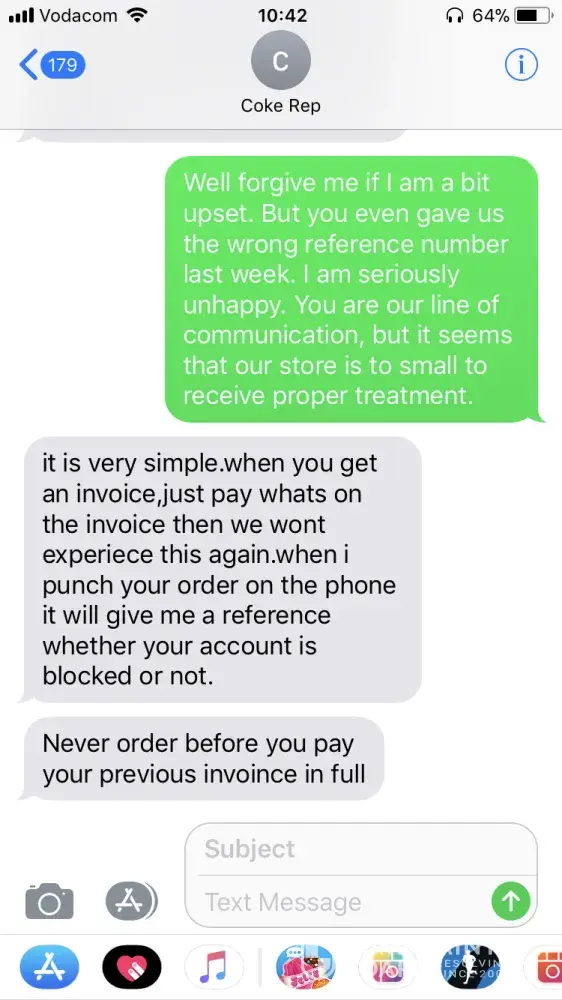 HI my name is Ayanda from AYA'S Bakery in katlehong in the east rand i called one of your reps Amos who was working the area at the time requesting to be registered as a vender and requesting a cooler so the beverages can be cold, visible & our customers can see, but months went by of me calling without any one coming to my establishment, he told me he doesn't work the are & i should call sphamandla and the same happened, until he told me he doesn't work the area anymore and i should call Andre who did send a a rep and then months went on without feed back, i called to find out i have never been registered as a vender & he told me he doesn't work the area anymore & referred me to Reuben, whom after a month found out that my paper work was never filed and Gugu the rep was walking around with it still, two months later they eventually registered me as a vender only to tell me i wont be getting a cooler but i must buy stock anyway, i have no place to put the stock and im unhappy about the service i have received over the past year it has affected my business alot.