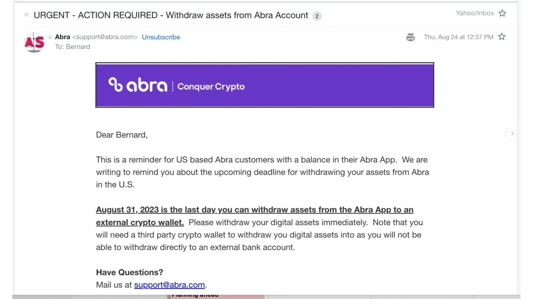 “This is the Abra Support Team, and this is a follow-up to our previous email. Based on our internal requirements, we will be restricting your wallet, and you will not be able to do bank or credit card transactions using the wallet(s). If you choose, you may still deposit BTC but you will not be able to deposit or withdraw using a bank account or credit card.