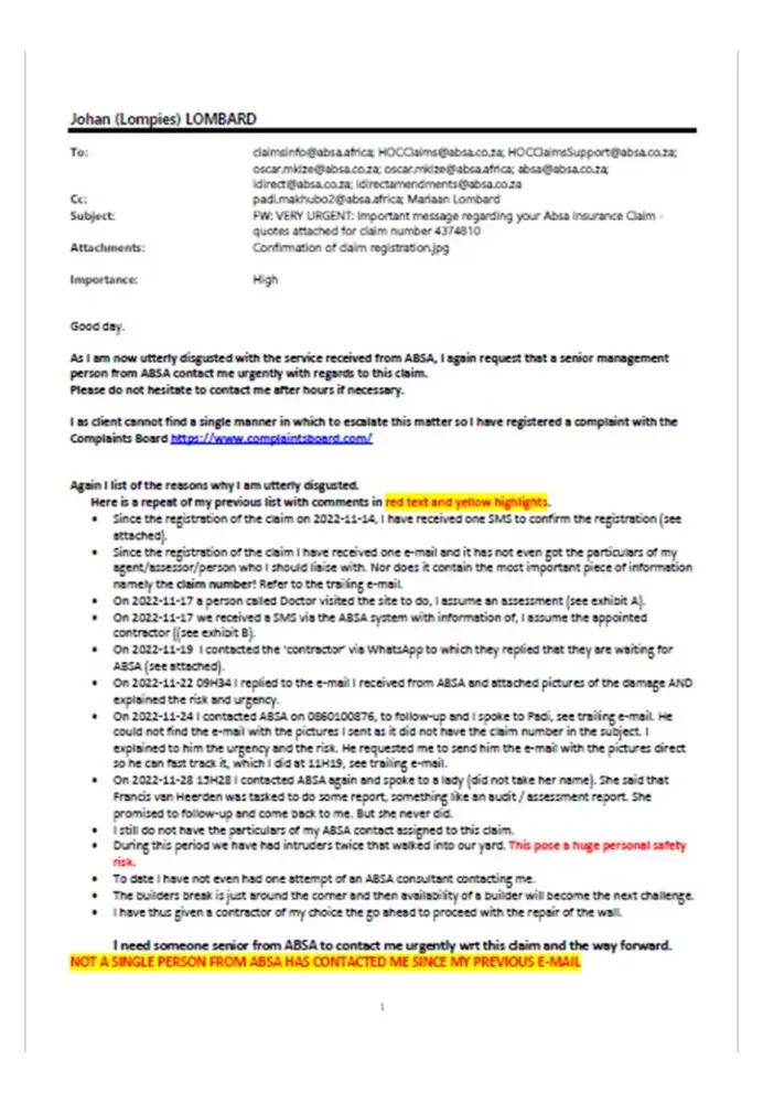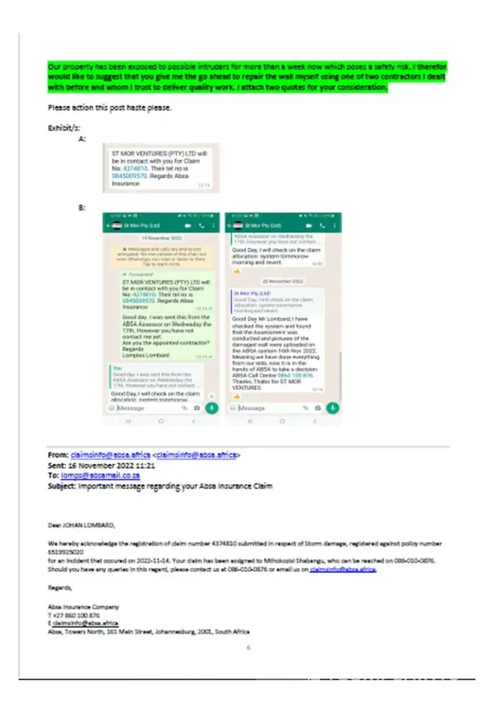 • On 2022-11-24 I contacted ABSA on [protected], to follow-up and I spoke to Padi, see trailing e-mail. He could not find the e-mail with the pictures I sent as it did not have the claim number in the subject. I explained to him the urgency and the risk. He requested me to send him the e-mail with the pictures direct so he can fast track it, which I did at 11H19, see trailing e-mail.