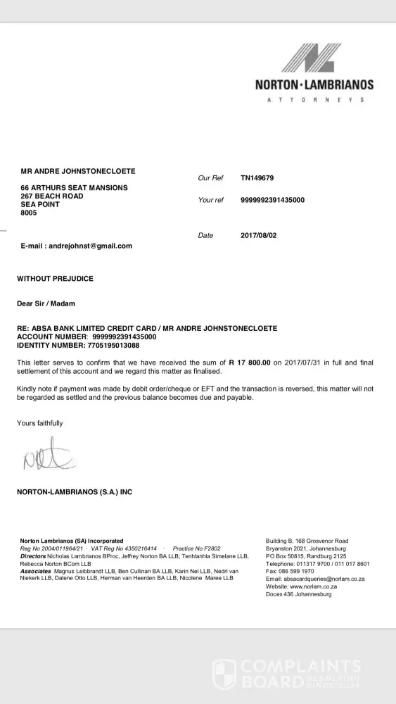 I have settled my Credit card with ABSA in July 2017. After numerous calls to the call centre and this is still not updated and closed with ALL the relevant credit bureaus. I need to updated immediately as ABSA had 21 working days to do so and failed to do this. I am at the point to take this matter further as they are not adhering to their obligations.
