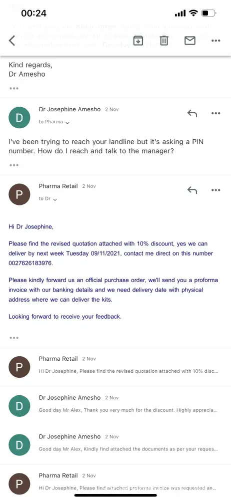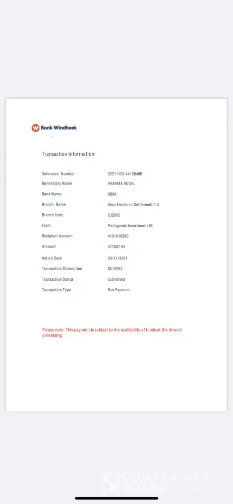 On 03 November 2021, I made payment into Pharm Retail account number : [protected], branch ABSA electronic settlement, branch code 632005 paid an amount of R 571807.95 for the supply of goods to Protagonist Investments CC in Namibia. After payment, I discovered that I was scammed. The contact person was Alex Khosa, a sales manager +[protected].
