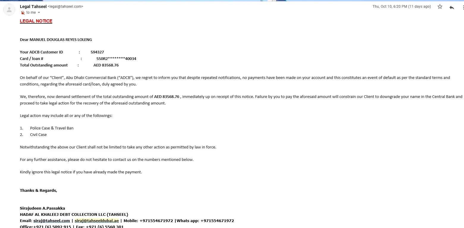 I had a ADCB credit card limit of 24, 000 AED. I have outstanding which is not paid. I was a good customer of the bank but due to job lost I came back India. And I am not working here.