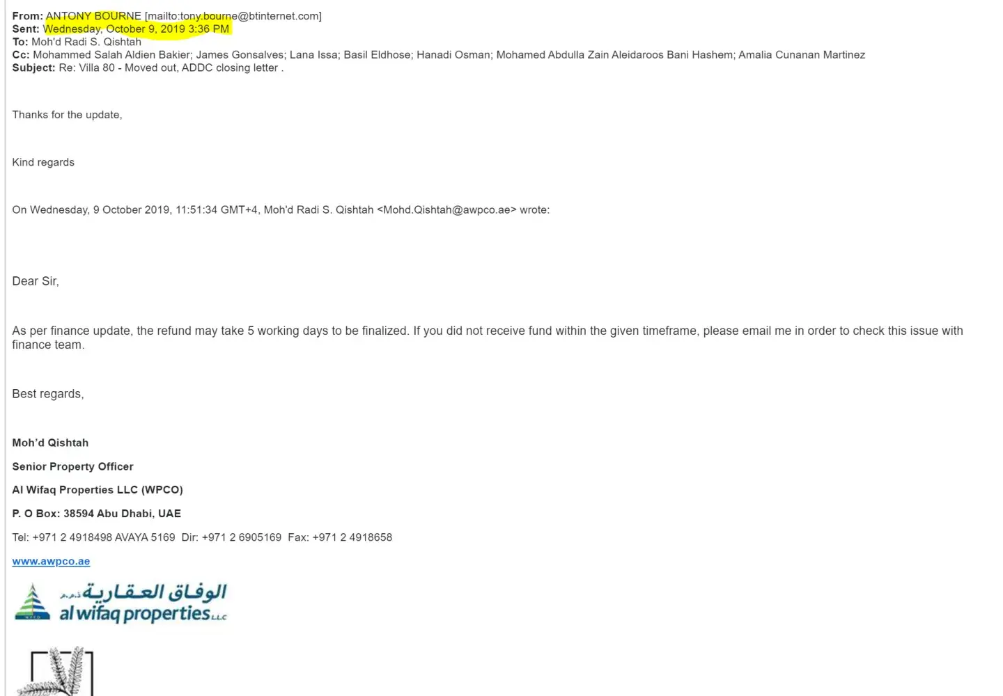 Hi, I was a tenant at the above property through Al Wifaq, part of Union National Bank. I now understand you have taken over from them.