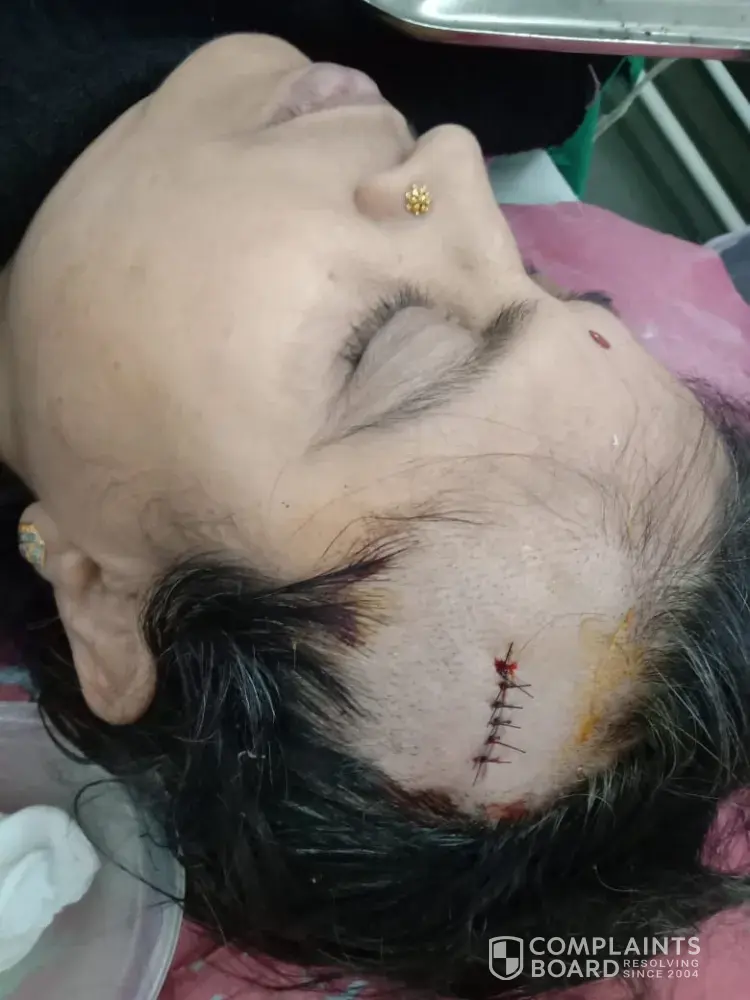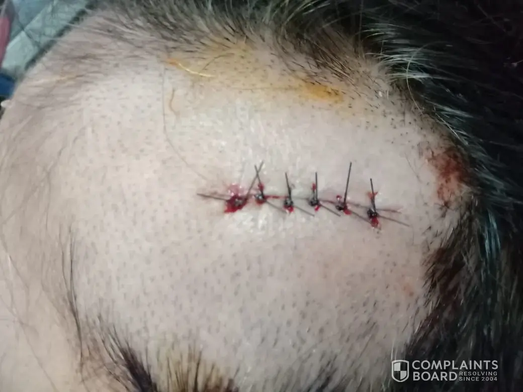 I was sitting in the waiting area to board my flight EY 288 to AMD on Feb 27, 2019 at that moment the employee stated that so and so group can start boarding. Employee who was helping me with my wheel chair decided to start going as it was part of my group to board, the pillars (similar picture attached at the end of the message) was on the right side of me, the sign which was made out of metal and fell straight on my head. The sign fell so hard I almost my senses and I immediately started bleeding, couple of the passengers came to help out while the employees stood there did not do anything. The passengers offered me some cotton so my bleeding can stop, and then finally the airport employees came to help. Doctor was not present or been called despite head injury. Some medical crew came, they consider as this is a minor injury and quickly applied some cream to disinfect the wound and pressured down on the head so the bleeding can minimize. They could not even take me to the medical room to see how bad the injury was, they just did the temporary patch. I asked one of the employees if I could get some water as I was feeling dizzy and they said "I am sorry but you will need to pay for water.." at which point I was very furious to how could pay for something as I was in that condition. The medical crew made the wound look like it was just a minor wound and send me off to board. With the sign falling on my head, I was feeling dizzy and was barely able to process anything. When asked for anything no response was given as they kept claiming that "I do not understand." Any broken English can be defined in this situation, they the passenger is hurt and should be given all the medical attention, but there was no such thing as humanity in any of these employees. Benefits for the seriously injured passenger was not explained properly to me. Please note any human being who gets hurt like this will be in shock and feeling dizzy as the sign was made out of metal. Upon reaching my country I was still bleeding and I had to be taken to an emergency and the doctor advised that I need to get the stitching right away due to the fact that the cut was very deep. The doctor gave me seven stitches and scan my head to make sure there was no crack, I am still waiting for my CT scan report results. Please note all the pictures of my wound are attached as well a similar picture of the sign that fell on me during my travel.