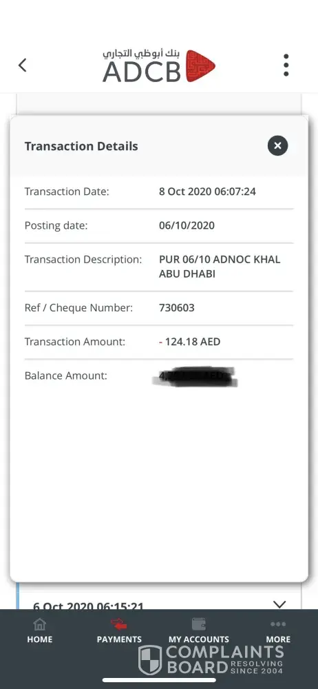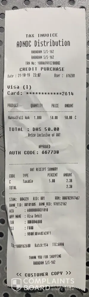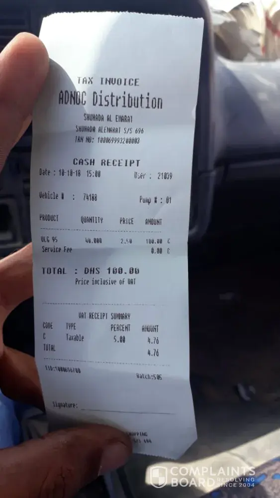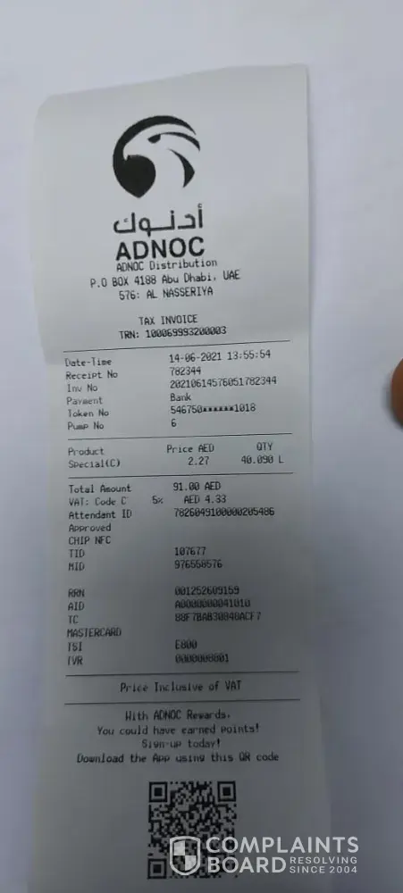 On 06 October 2020 I went to one of the Petrol Stations in Khalifa City A (Abu Dhabi) to get a full tank of Special fuel 95 (petrol) and paid 124.18 AED (receipt number 730603), which I paid by Debit card (ending with XXX9911 linked to my ADCB account XXX141001.