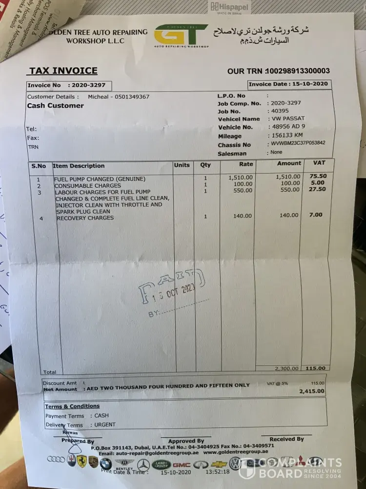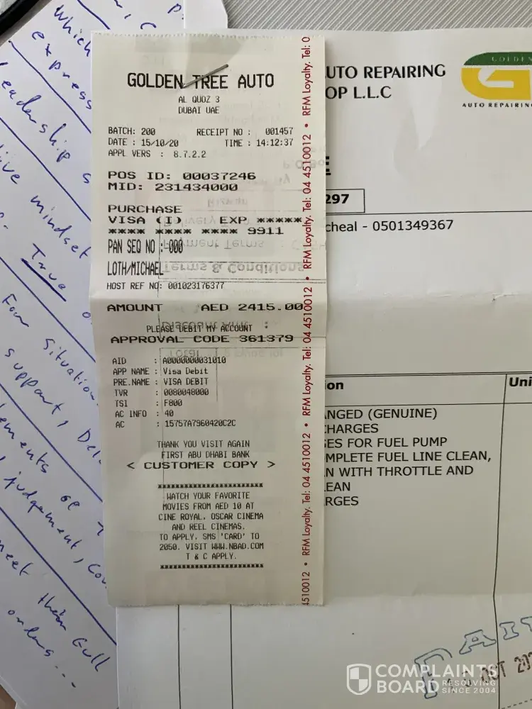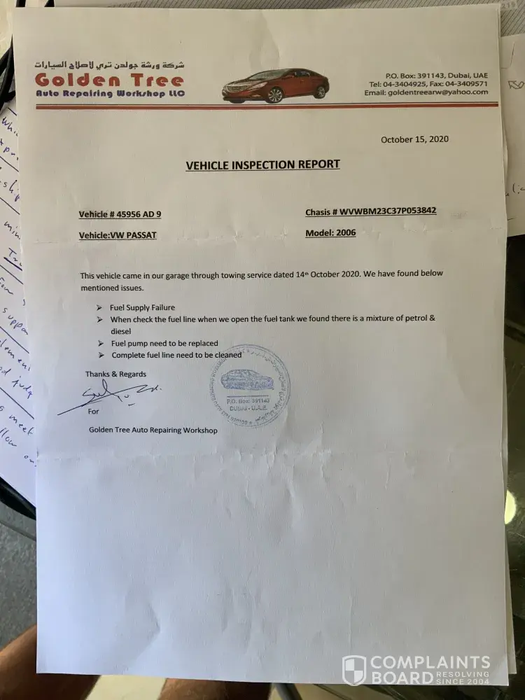 On 14 October 2020, I had to get my car towed to the Golden Tree Auto Repairing Workshop LLC in Dubai, who replaced the fuel pump and cleaned the entire fuel line. (Please see attached the report and invoice for your reference). I tried to call ADNOC Customer Service Hotline on 800 300 to file an official complaint but no success after holding for hours. I do not even think that there is anyone working at the Contact Centre and the company hopes that we will just hang up.