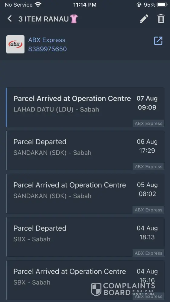Since 13/08/2021 until today my parcel tracking not moving.. what kind of service is this.? Since Shopee start using ABX, I'm very2 frustrated as ABX take 5-7 days process before the parcel is out for delivery, when the status is out for delivery, it will take another 3-4 days to reach me.. up to 10-12 days in total from the parcel arrive to Sabah from china the delivered to me.. worst courier ever.. Please learn from JNT, I really happy when JNT pick up my parcel as I know I will receive my parcel on same day or the next day.. WORST COURIER SERVICE EVER, ABX KOTA KINABALU