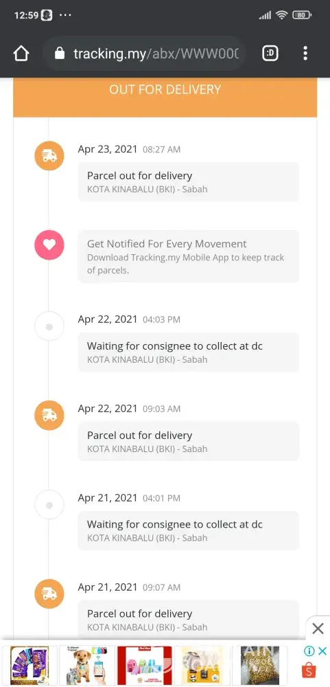 My parcel has arrived at ABX branch tuaran (BKI) on 17/04/2021 but until today 23/04/2021 i have not received my parcel. I called and WhatsApp to followup yesterday and asked why my parcel out of delivery from 17/04 until 23/04 and they said need to wait the runner. I hopeless because ABX took so long to delivery the parcel to me, for information this happened many times.