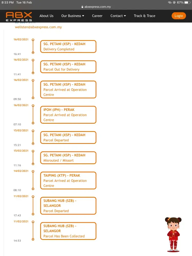 I had two parcels from shopee. Two of my parcels MY2009254296586 and MY205356728071V had reached abx express sibu branch on 4/1/2021. Up till now (9/1/2021), I did not receive any of my parcels. Today when I traced my parcels, it was written items successfully delivered, and yet I didn't receive any!