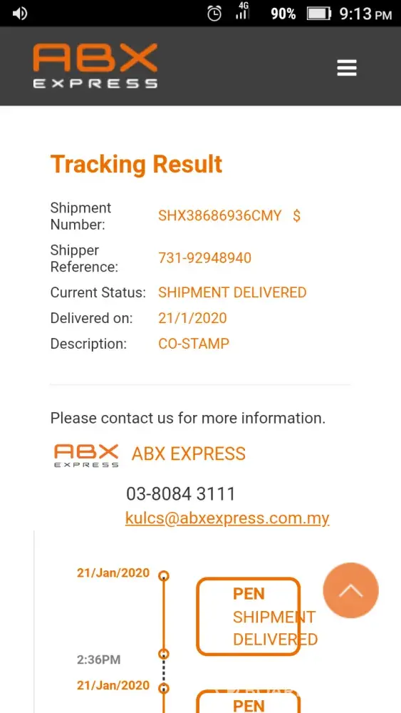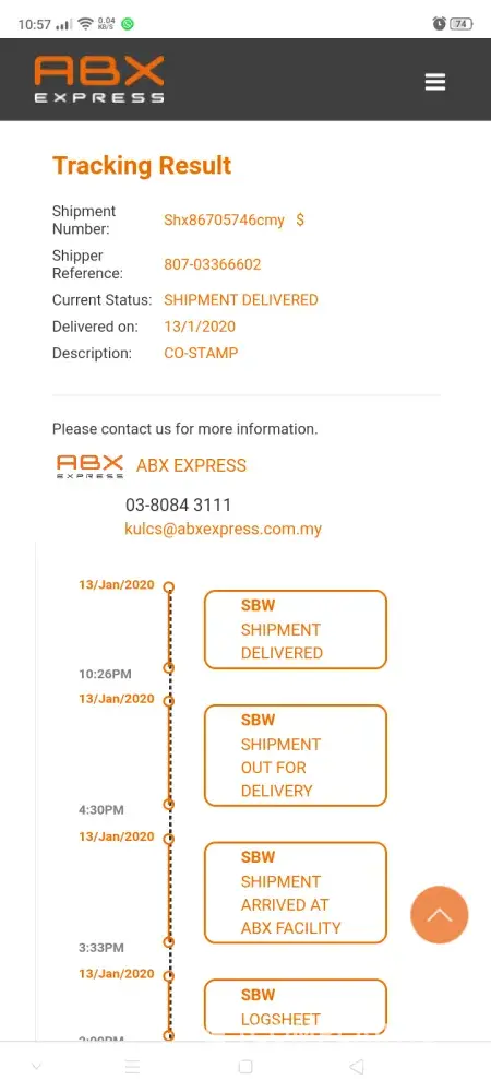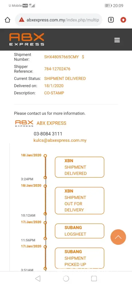 Hari ni almost 1 whole day tunggu delivery. Out for delivery pukul 4:30 petang, tunggu punya tunggu tak sampai². Tiba² check sistem abx cakap "Shipment Delivered", padahal takda pulak yang datang hantar depan rumah. Lepastu delivery pukul 10 malam dah kenapa? Delivered kat sapa pulak? Kita beli guna duit tau bukan cabut bulu nak beli barang tu. Kenapa abx teruk sangat servis ni? Dari dulu sampai sekarang abx je bermasalah. Apa lah nasib beli barang overseas tapi shop guna abx express untuk penghantaran barang. Tgok nama abx pun dah tepuk dahi. Memang dah jangka benda ni akn berlaku memandangkan banyak complain dari customer lain. Takda guna buat survey complain ni kalau tak ambil endah pun pasal customer service. Mana pergi customer rights eh? Nak kena report polis barang dikira hilang baru nak bertindak ke macam mana? Sila ambil tindakan. Paling takboleh brain bila buat penghantaran guna runner je.
