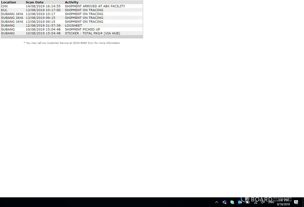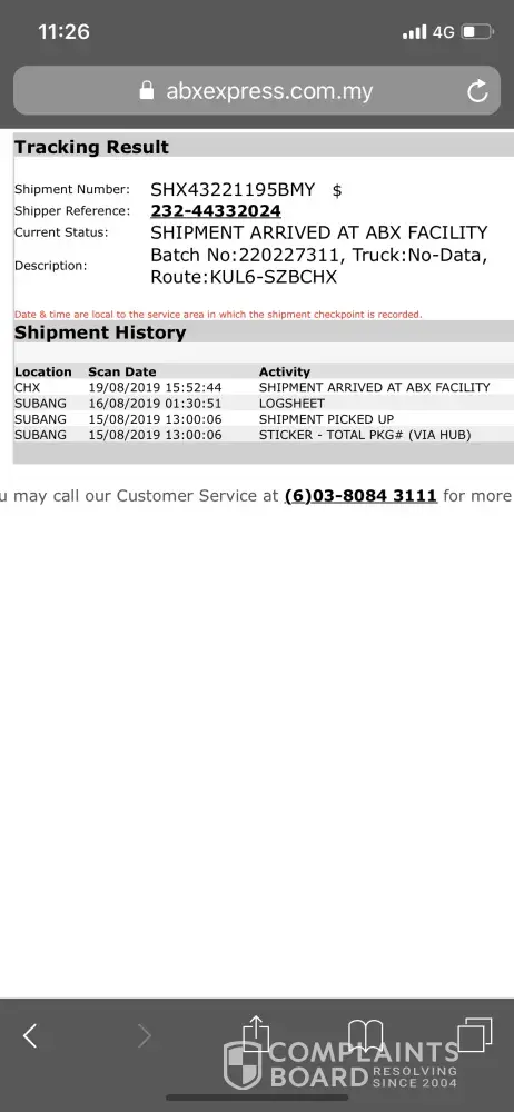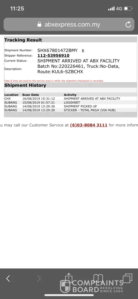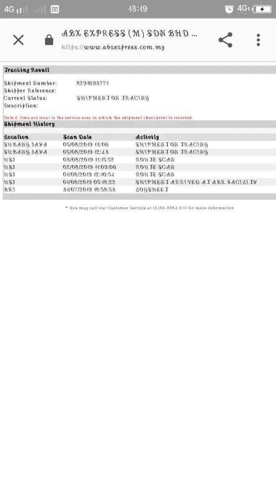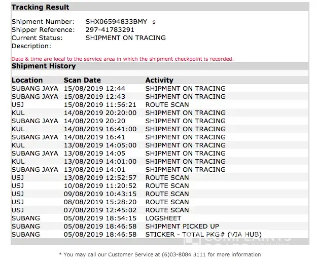 No shipment update since 13 Aug 2019! The parcel arrived in Malaysia on 7 Aug 2019 and it has been lapsed of almost 2 weeks time, i still didn't receive my parcel. As per above shipment history, the parcel was stucked at ABX Cheras since 13 Aug 2019 for unknown reason.