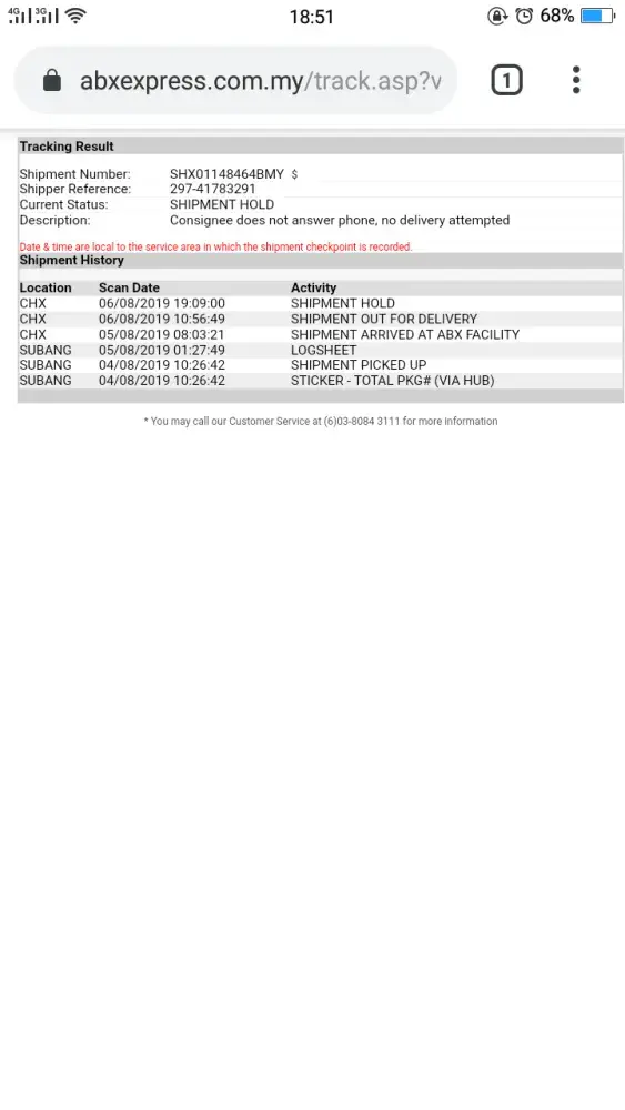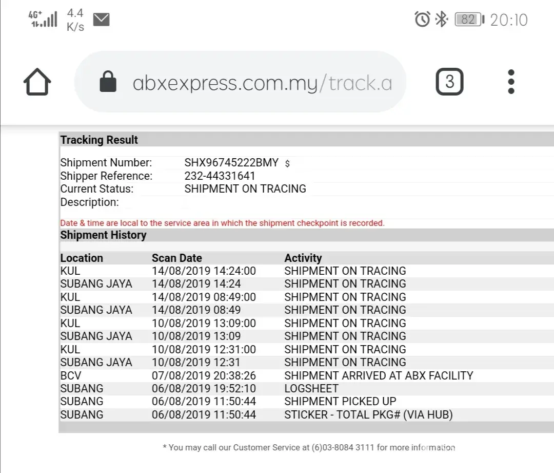 Im ordering few item from shopee...one of the parcel should be received by me approximately on 16 August...i have made a call to abx hotline and they told the parcel was at abx facility since [protected]@ 8august 2019...i have made more than 30 calls to abx express klang but no one pick up...