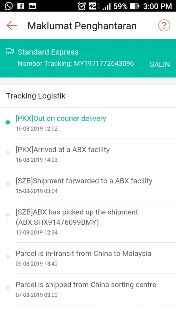 Beli brg dari China..sampai di abx tgm 1 Ogos 2019..tapi sampai sekarang masih tak terima apa2.ini kali kedua abx tgm buat begini. Pembelian pertama akhirnya saya cancel, mls nak tggu dah.rupanya, brg yg ini, abx juga yg amik..caj penghantaran berbayar., Jika x mampu nak hantar, jgn trima parcel seolah2 mampu nk hntar. Dari awal tolak. Jadi, sbgai syarikat penghantaran kenalah laksanakan tanggungjawab itu sekalipun terpaksa hantar di pedalaman ke, jauh ke. Langsung tak ada intergriti dlm melaksanakan kerja. Pihak atasan tolonglah pantau pekerja2 yg ada di branch.