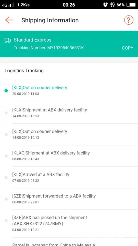 I placed an order from shopee on 04/08/2019 and the goods arrived from China to ABX USJ on 10/08/2019 but i did not see any delivery updates since then. I called ABX on 15/08/2019 to report the delay and was told that the delivery will be made in another two days but until now, 21/08/2019 i have yet to receive my parcel. No one is responding to my call either. And i did pay the shipping fees.