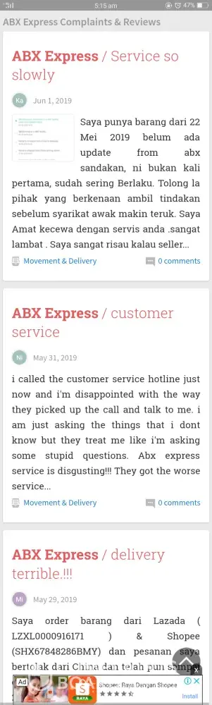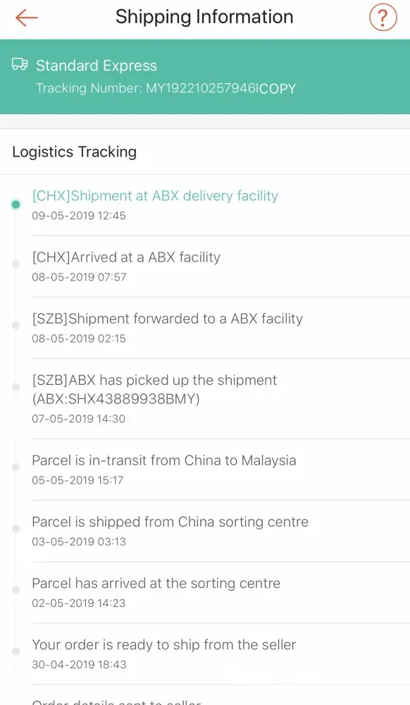 Saya order barang dari Lazada (LZXL0000916171) & Shopee (SHX67848286BMY) dan pesanan saya bertolak dari China dan telah pun sampai di ABX Kota Kinabalu (BKI) pada 22 Mei 2019. Sistem ABX tidak dikemaskini sehingga 27 Mei 2019 dan saya sendiri ikhtiar untuk menghubungi ABX cawangan Sandakan. Pesanan saya dari Lazada & Shopee sudah sampai. Yang menyakitkan hati saya, hanya pesanan Shopee yang saya terima pada 27 Mei 2019, manakala pesanan dari Lazada tidak di hantar. Saya menghubungi semula pada 28 Mei 2019, dan wakil ABX menyatakan akan membuat penghantaran pada hari tersebut. Masih tidak dapat terima, saya menghubungi lagi pada 29 Mei 2019, STILL alasan yang sama, akan di hantar! Please, tolong tingkatkan prestasi ABX ni.. Jangan buat kerja sambil lewa!