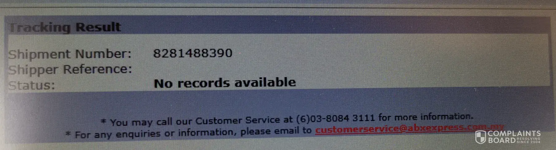 Therefore, I will need your kind assistance to check this courier for me. I understand that there might be some delay due to Hari Raya, Malaysia's public holidays, but it will be unacceptable if the record of my courier can't even been find from your system. Please check accordingly and revert to me the soonest. Attached here with the photos of receipt with AirBill number and the snap shot of result that I obtained when tracking in ABX tracker.