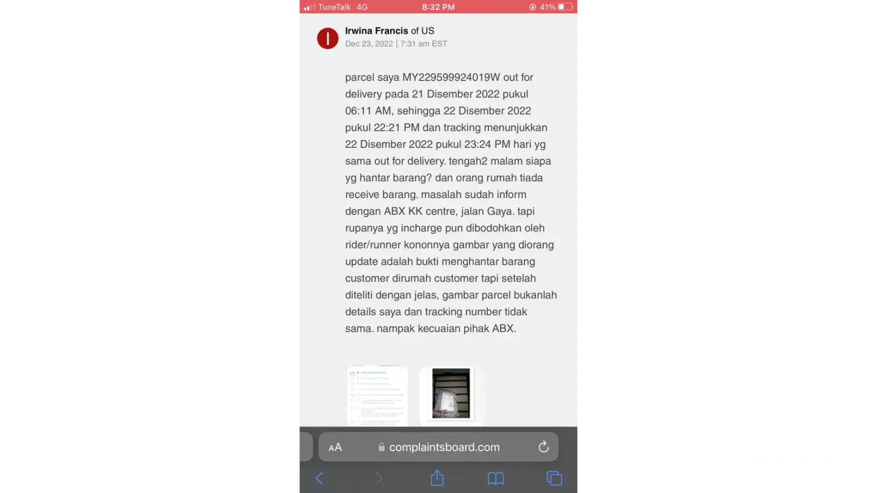 parcel saya MY229599924019W out for delivery pada 21 Disember 2022 pukul 06:11 AM, sehingga 22 Disember 2022 pukul 22:21 PM dan tracking menunjukkan 22 Disember 2022 pukul 23:24 PM item delivered. tengah2 malam siapa yg hantar barang? dan orang rumah tiada receive barang. masalah sudah inform dengan ABX KK centre, jalan Gaya. tapi rupanya yg incharge pun dibodohkan oleh rider/runner kononnya gambar yang diorang update adalah bukti menghantar barang customer dirumah customer tapi setelah diteliti dengan jelas, gambar parcel bukanlah details saya dan tracking number tidak sama. nampak kecuaian pihak ABX.