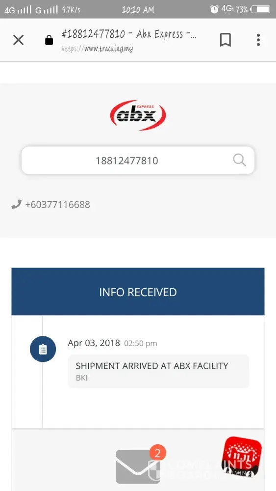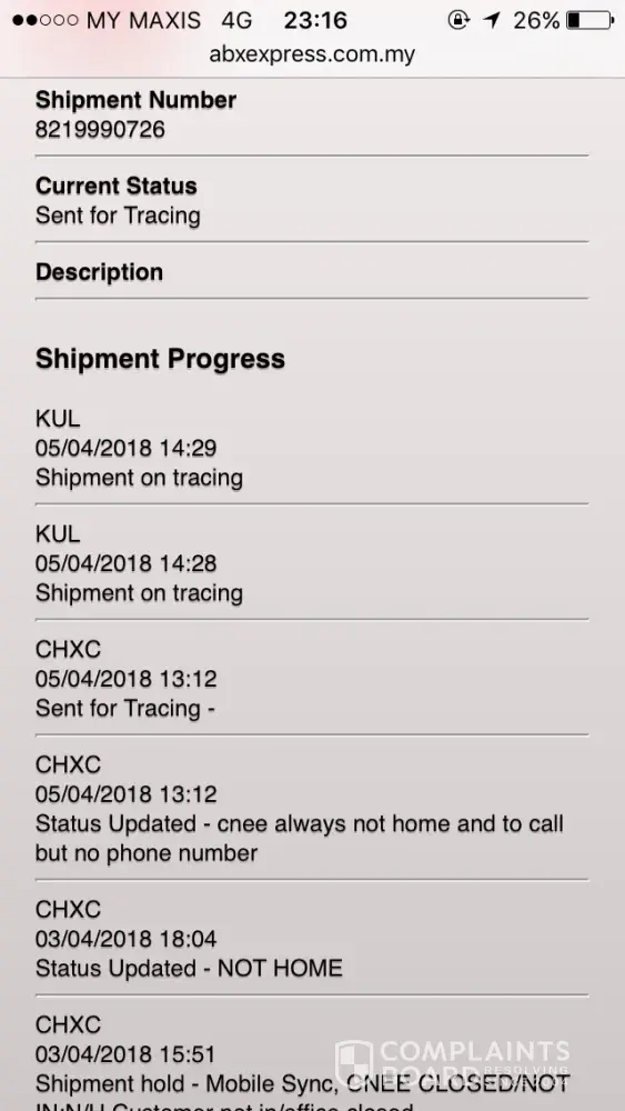 I've called to ABX HQ yesterday and called Kajang today to check my courier update. I've try to called because no body pick up phone. Yesterday I called ABX, he told me will arrive before 5pm and today I called again to Kajang braches, he told me they no driver to delivery the parcel and will reach my place before 5pm. But until now I still not received the parcel yet. I've try called to ABX and no body pick up phone. I feel very bad service for this, show give me a right way, if really can't delivery to me on time should inform me. I need my parcel urgently but ABX keep delay it for how many days.
