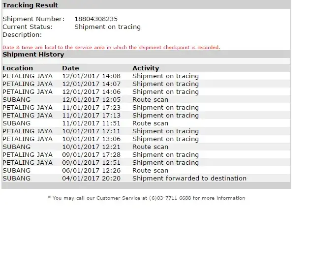 I have never seen such a delivery company in all my life. Holding my parcel for 11 days now. Whenever i cal them, they keep saying we have contacted our Subang branch to arrange for delivery. They even went as far as giving me the Subang branch number but no one ever picks them. This is completely wrong, up till today there have been delivery no phone call. TI have seen such a delivery company in all my life. Holding my parcel for 11 days now. Whenever i cal them, they keep saying we have contacted our subang branch to arrange for delivery. They even went as far as giving me the subang branch number but no one ever picks them. This is completely wrong. here is the tracking number [protected]. My parcel has been in subang since the 8th of September, 2017. Kindly resolve this issue as soon as possible.