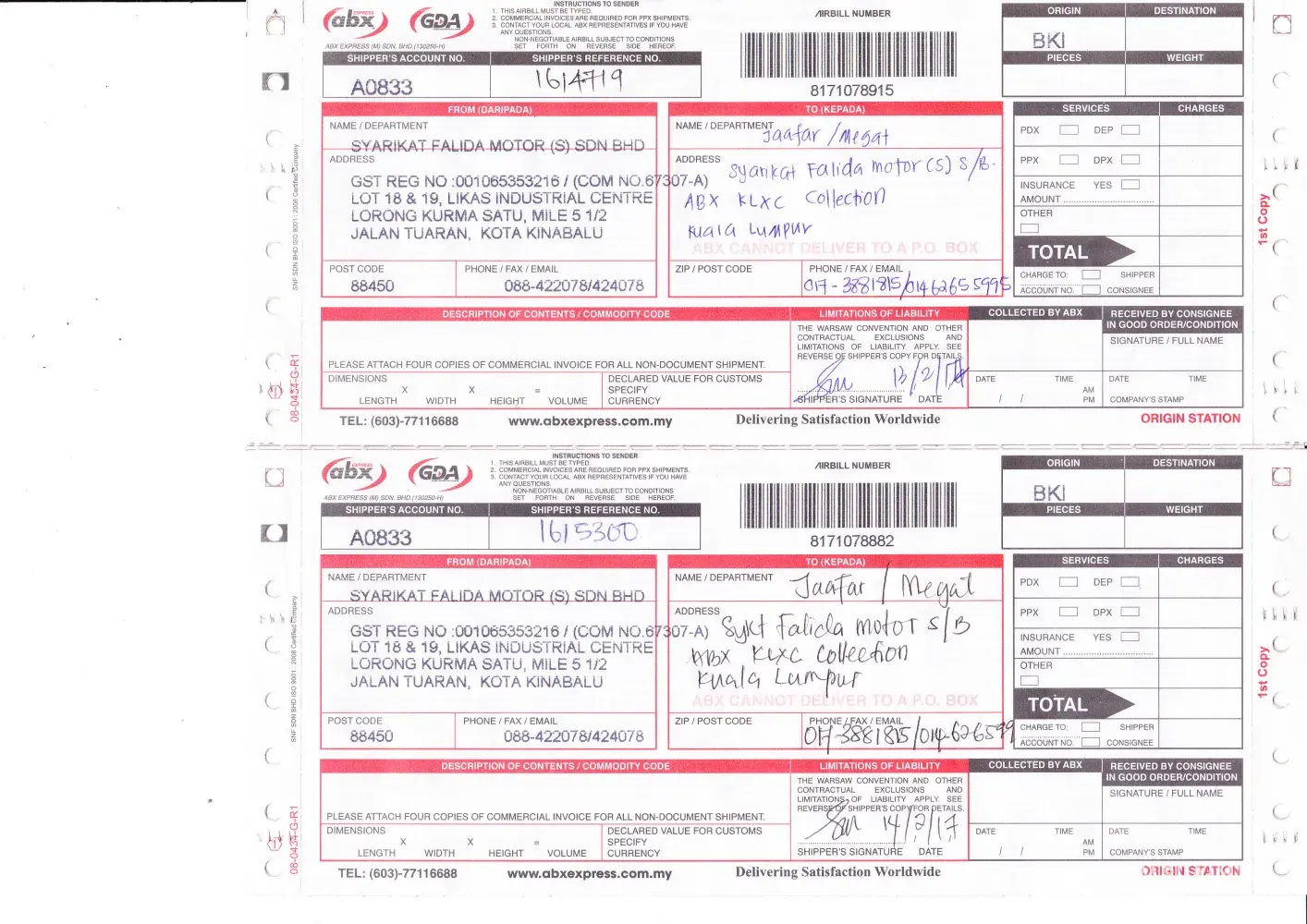 Fyi, this was not the first or second time ABX's failure to pick our document, but it has happened so many times and every time we asked your K.K. branch about this problem, it seems that nothing really done to improve the service but instead it getting worst.