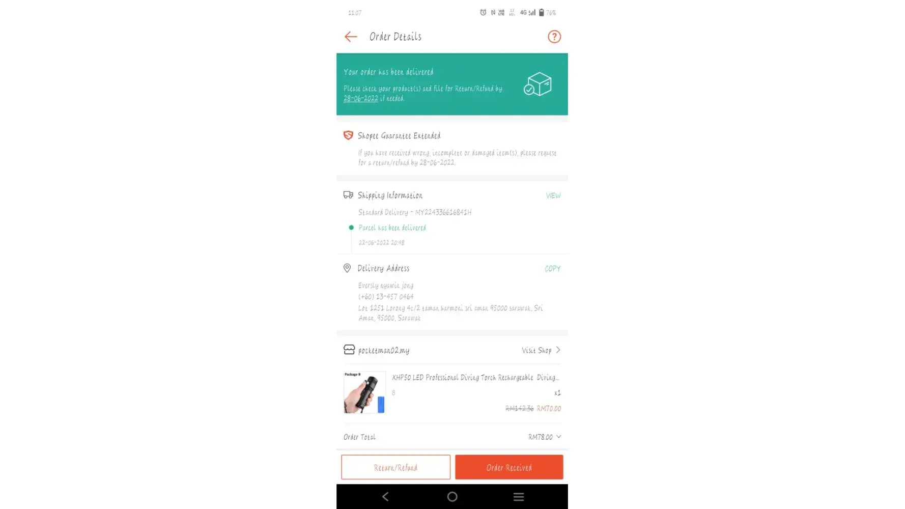 Saya oder barang melalui shopee menggunakan alamat pejabat.