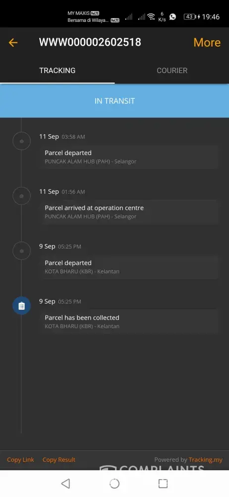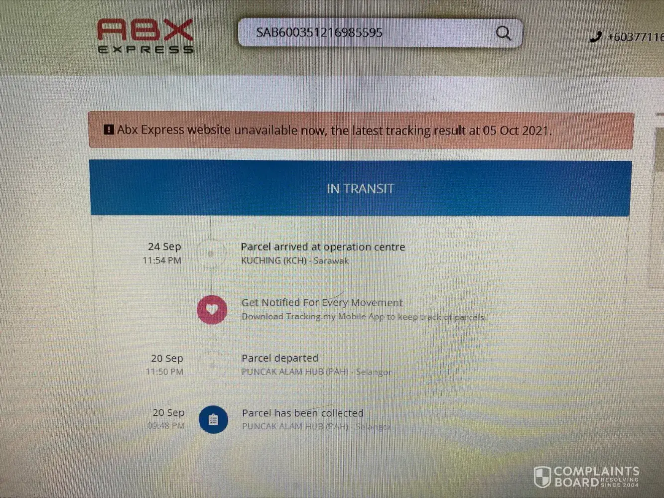 Initially my parcel was processed by a different delivery company which is POSLAJU MALAYSIA. After it arrived at Malaysia from China, the parcel delivery service changed to ABX Express. My parcel had arrived in Kuching on 1st October but it is stuck at the station. The location of the station was also not provided by ABX. The ABX Express tracking number provided is SHP18985560DMY but I couldn't track the parcel using that number.