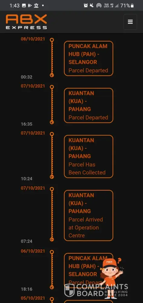 My parcel has arrived at the station and it was said at the tracking delivery attempt would be made by 3/10/2021. But ABX in Kuching aren't taking any action towards my parcel. Is this something I should complain to every company everytime? Only about their delivery service? PLEASE FIX THE PROBLEM! THOSE STUFF ARE IMPORTANT! Bukan satu but 5 items yg dah sampai. Tolong la ABX do something about your employers 🙂