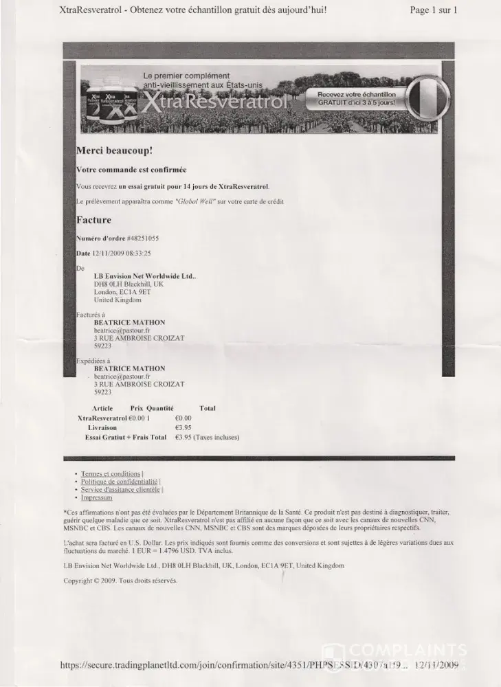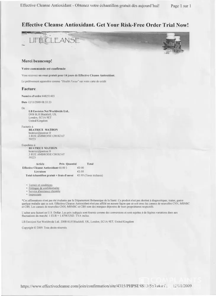 I would want to stop immédiatly all my contracts been supposed to be with your company for the purchase and the sending of the following 3 products " effective cleanse antioxidant " "XtraResveratrol" " Absolute acai Berry " This achaats was charged to Beatrice MATHON 03 Rue Ambroise CROIZAT 59223 RONCQ ( France) and spent by the e-mail address: "[protected]@pastour.fr".