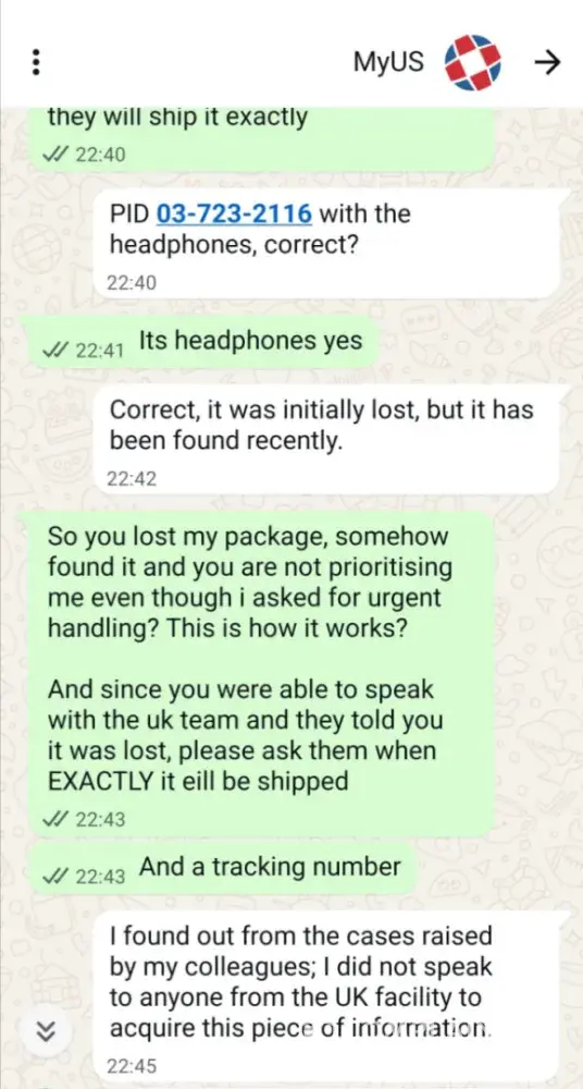 Support agents admitted in writing that the parcel was lost and later “foundâ€, yet they refused to release or ship it. Their UK phone line never answers, and WhatsApp support repeats “please wait 1–2 business days†before closing chats with no follow-up.