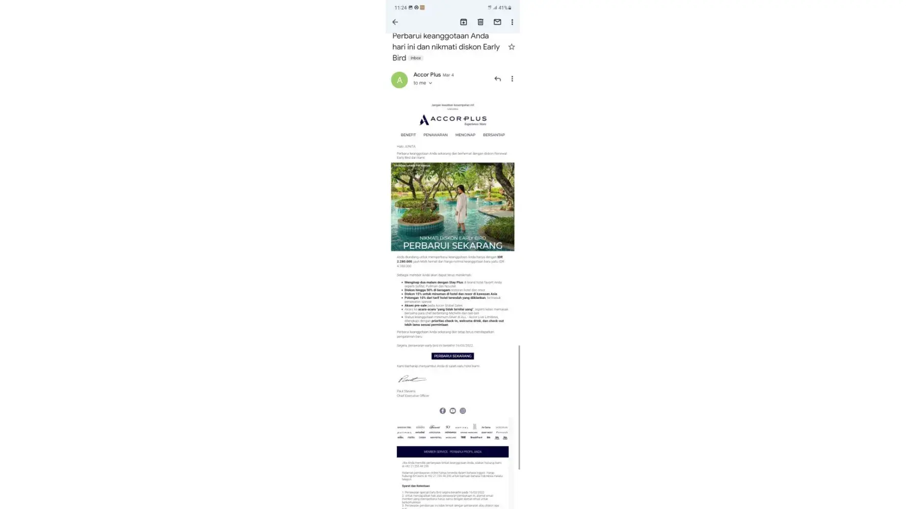 On March 4, 2022, i received an email from Accor Plus to renew my membership only Rp 2.280.000 for 2 free nights. So I called the sales agent & asking for the explanation. She said the the email was mistyping. I can understand the human error of mistyping but I want an email to explain that the previous email because of mistyping.