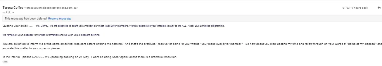 I am writing this email to complaint on your service level of the Accor Plus Membership program.
