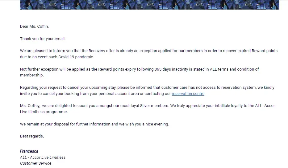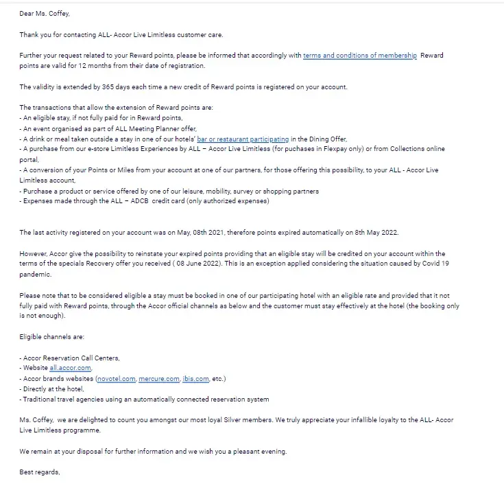 They just cancelled all my points (my complimentary GOLD membership paoid) stay, without any reminders or notices. I messaged them directly on the day they notified me to coerce me into paying more money and stay at a hotel before 8 June.