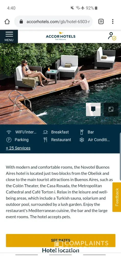 Hello, we booked Novotel in Buenos aires for 10 days for the main reason because a swimming pool ans turkish sauna was advertised on the website. When we arrived, we discovered the the swim pool is seasonal and the sauna does not exist anymore. I think it s a serious issue, you misguided us for 10 days of our holidays. What should we do now? That situation is really upsetting.