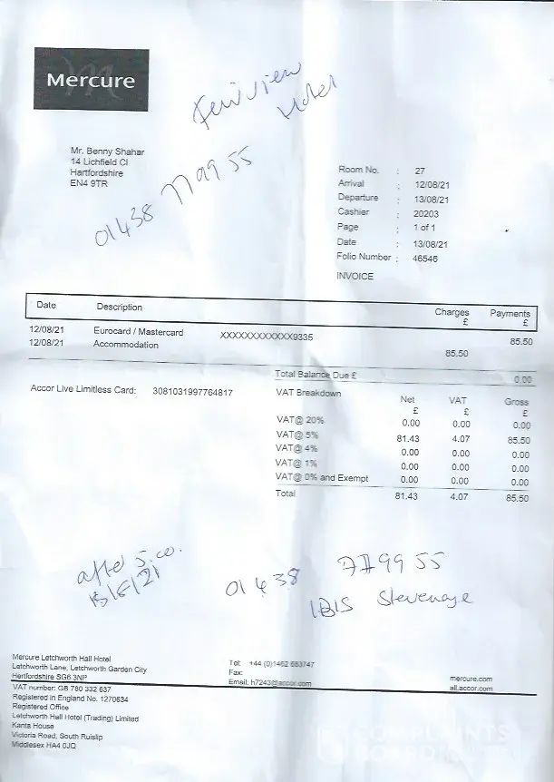 As stated above, I will be making a formal complaint to Accor as I am certain the behaviour stated in this email, breaks a number of their standards.