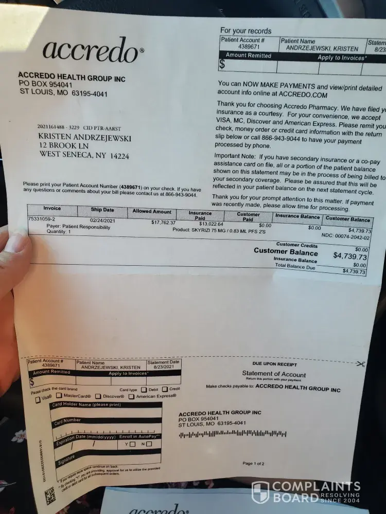 On Saturday, August 28, 2021 I received a past due notice from Accredo in the amount if $4, 739.73. Since I have never heard of Accredo, I tried calling but of course they were closed. I called again on Monday, August 30th and spoke with a woman who stated that although she was able to pull up my account (and I use that term loosely as I've never used Accredo) but didn't show a balance due. However she told me exactly what medication the bill was supposedly for, who called it in and when it was called in. Bonita at Dr. Kalb's office called a script for Skyrizi in on September 22, 2020. I have never been to a Dr. Kalb. The lady at accredo stated she was unsure why I was receiving a bill as the script was transferred to Walgreens Pharmacy, whom I have also never used. When I got my mail that day, I received ANOTHER bill from Accredo stating that they billed my insurance $17, 762.37 of which the insurance paid $13, 022.64 leaving me a balance of $4, 739.73. Not only is this a fraudulent bill but this company is collecting from money from insurance companies that they are not due. When I asked WHY I was getting these bills the response was "I'm not sure". This is ridiculous, fraudulent activity and I would like it cleared up immediately!