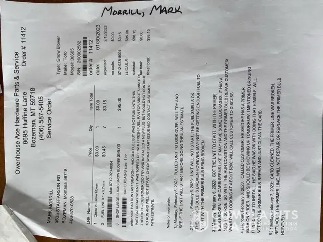 When I talked to the guy at that desk to say what the snow blower was doing and that it did have old gas from last year and that it could be a dirty carburetor his response was "How much do you want to spend?". At that point I got a bad feeling and I should have walked away. But I left it with them to fix.