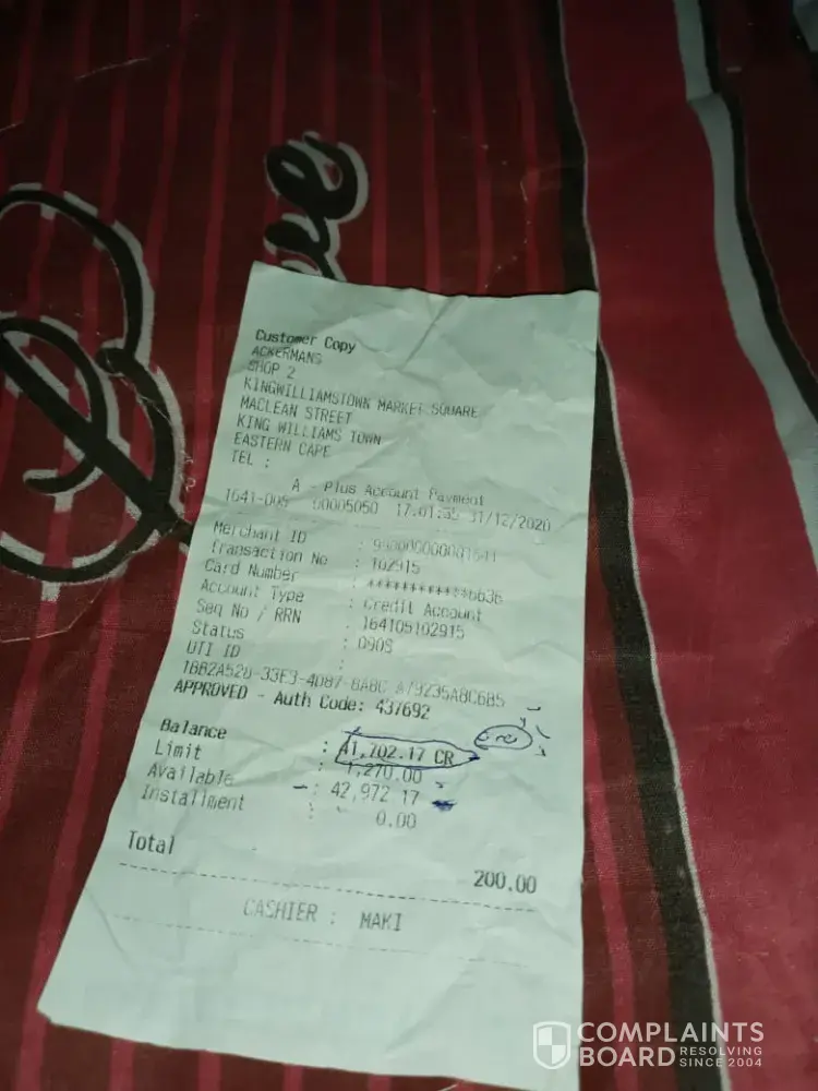 All the tellers were surprised by this and they all explained that I can take anything up to R 41 702 without incurring any debt because Ackermans owes me this amount. I then took items and in January 2021, I receive a statement saying my debt balance is zero confirming further that I do not owe. But strangely in February 2021, the statement came saying I have a debt of R7000 and my credit balance is zero (meaning the 41 702 credit balance disappeared and the things I took in December were now a debt).