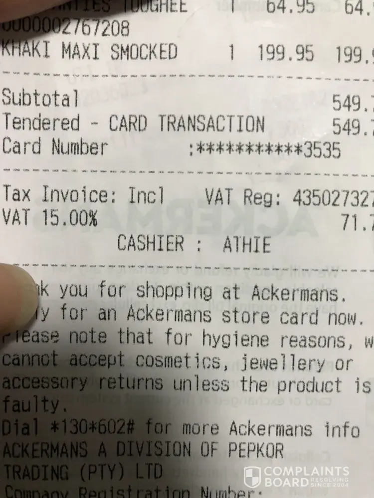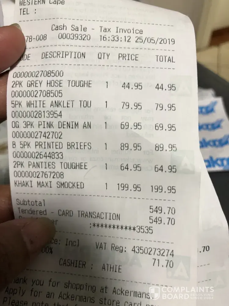 Who's going to pay my petrol money to go back to the store and for my parking and who's going to do something about this? I am not one to complain or go to social media but 1st I was irritated with the cashier and a manager or supervisor was standing behind him also ALSO this is NOT THE FIRST TIME i have been overcharged at Ackermans!