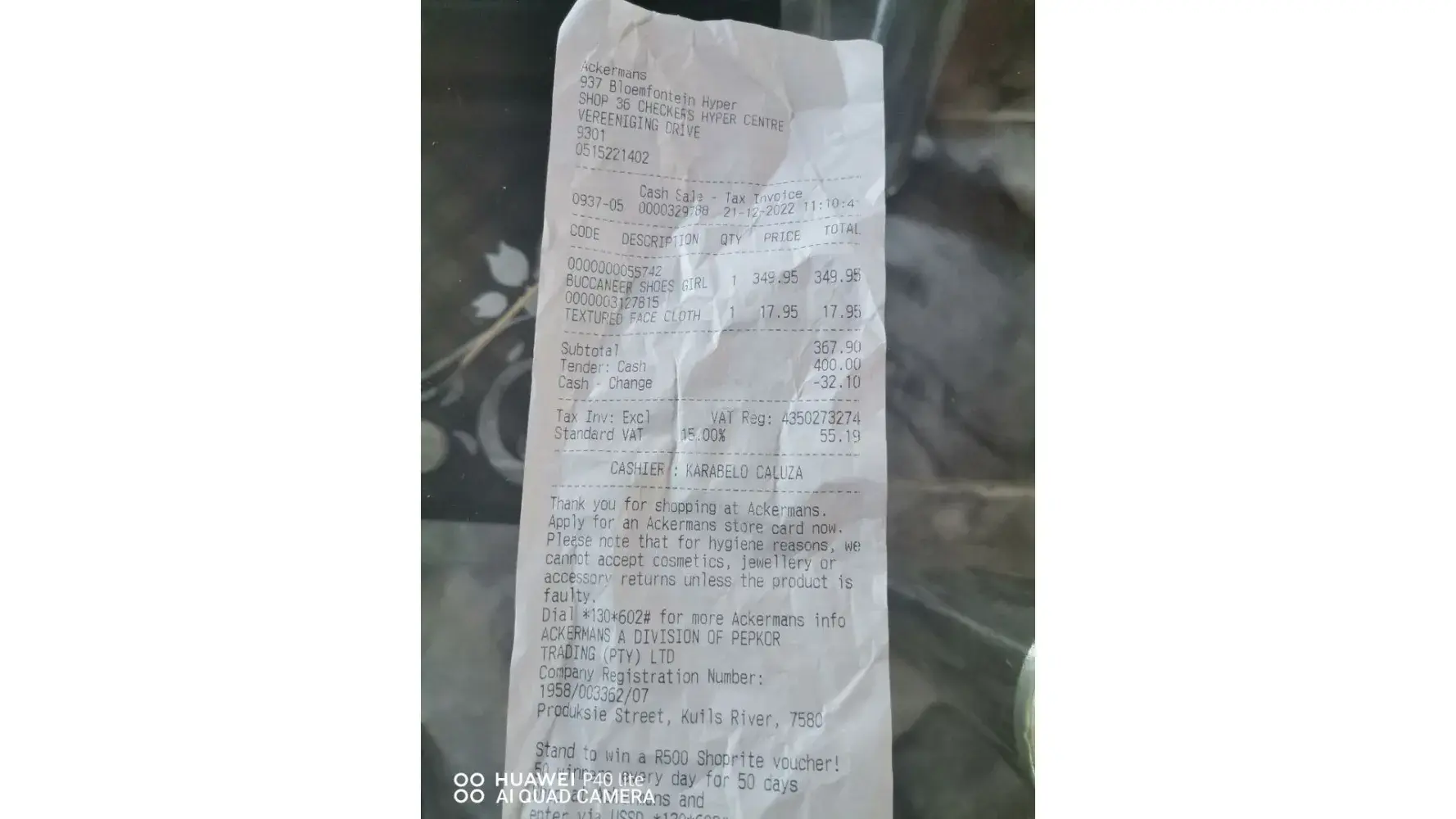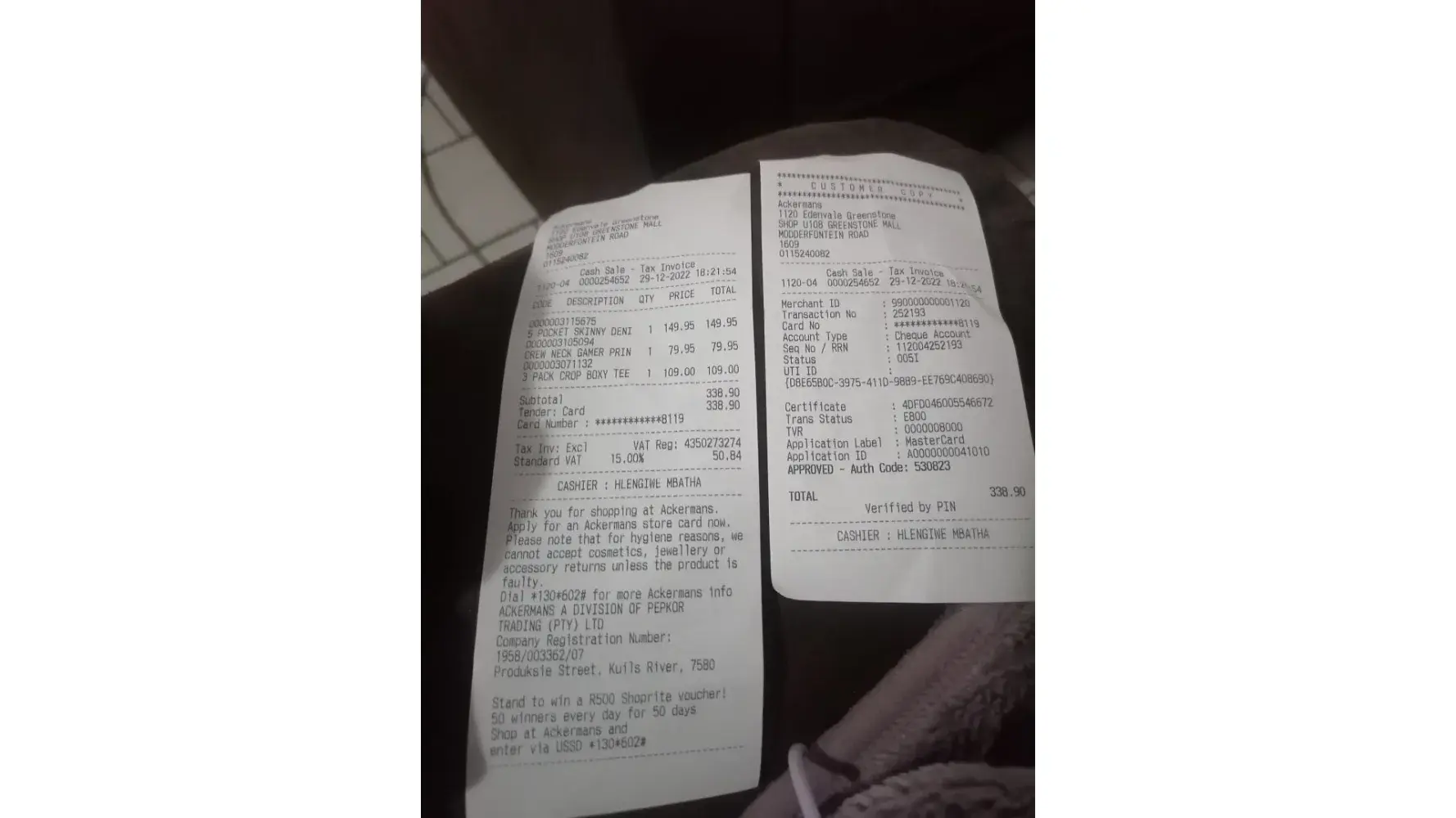 I was at Akermans Greenstone branch on 29 December 2022, and the shop had just closed at 18:00, I quickly rushed to the till points and to my dismay all cashiers were busy cashing up and I had to stand there watching all of them about 4 or so while only one cashier was serving another customer on top of that she also let another customer to cut the que in front of me, she eventually serviced me about 15 minutes later and I told her that what was happening was not acceptable for all cashiers to close tills while there was customers in the store and I knew that for a fact because I also worked as cashier. The treatment I received from that branch was the worst I have ever seen in my life, staff members just ignoring a customer's like it was normal, I also took a video of the incident of which I can send on request but I will attach the slip for ease of reference to collaborate the times and dates stated above.