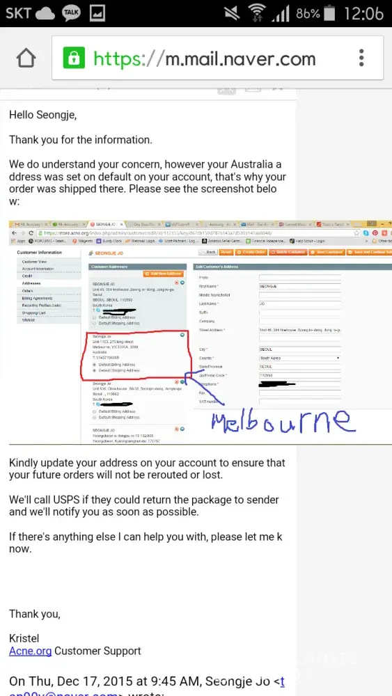 Hi. My name is Seongje. I am from Korea. I am writing this to disclose what Acne.org did. I have been using their products since 2012 when I was in Melbourne, Australia. A few days ago, I bought some products and I realized by the confirmation email that the shipping address was wrong. I don’t live in Melbourne anymore. I live in Seoul now but it said it would be shipped to Melbourne. At first, I thought it was my mistake but it turned out it was not. The evidence is that when I set my shipping address as the one in Melbourne, it is 120.61 dollars but the one in Seoul, 117.20 dollars. (Please check out the pictures I attached, picture 1 for Melbourne and picture 2 for Seoul, you will see each shipping cost) After I paid, I got a message saying that 117.20 dollars has been paid (picture3), which means I correctly chose the shipping address as the one in Seoul. However, they insisted that it was my fault based on their system (picture4) and they said they would not refund for that. But how could I possibly know about the system? And if I had known about the system, why wouldn’t I have changed it? Let’s say it was my mistake (it was not my mistake though) A ridiculous thing is that I got a mail saying that “if the shipping address is incorrect, reply to us†(picture5), so I responded with the correct address right after I paid and checked out the mail. However, next day, all I heard from them was they already sent the products out to Melbourne and I needed to pay for the shipping cost. If they never check out my email, why would they send me such an email? I explained the situation to them via email but they told me to answer their call to talk about the problem. Do they not know it charges me to receive an international call? And what was worse, they called me at night two times. They even don’t know the time difference. Thankfully, my friend living in LA called them instead of me but they said that only when I let them know the products arrive in Melbourne, could I get the refund only for the products. I tracked the record but I found out something shocking. For the last 6 days we were talking on email, what I ordered was still in San Francisco(picture 6), which means they even didn’t try to take it back and just let it go to Australia. It is so inefficient and they are so IRRESPONSIBLE. Now, I already gave up the shipping cost and I am trying to get back the money for the products. I am not writing this hoping you help me or I could get the full refund. I just want everyone to know what they did to someone like me so called a regular customer who has been using their products for almost 3 years. I think they are so beyond common sense because they are in pursuit of the small benefit not knowing that they lose a customer who could bring them larger revenue in the future. What do you think?