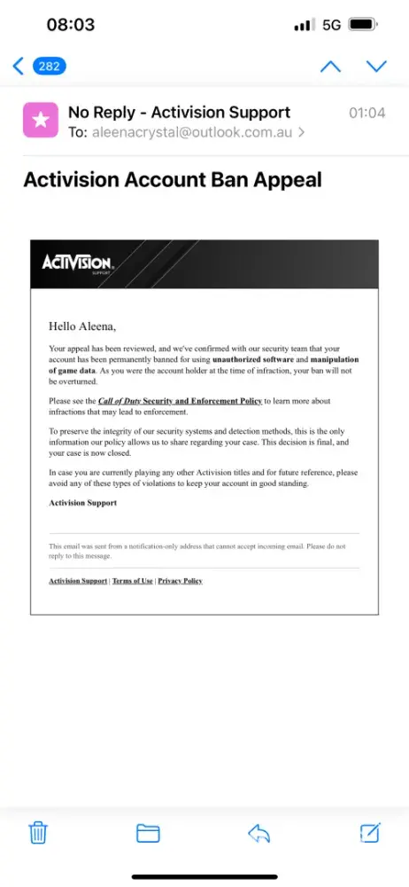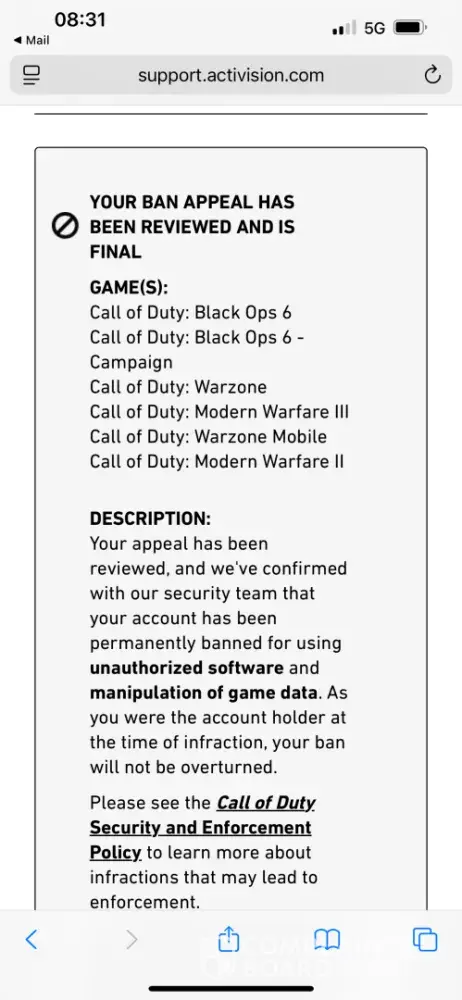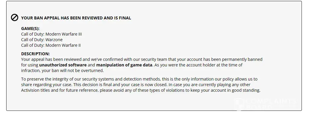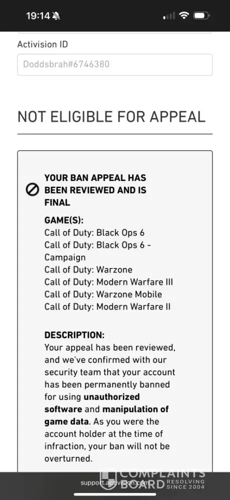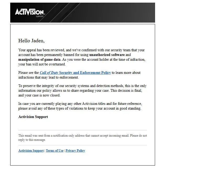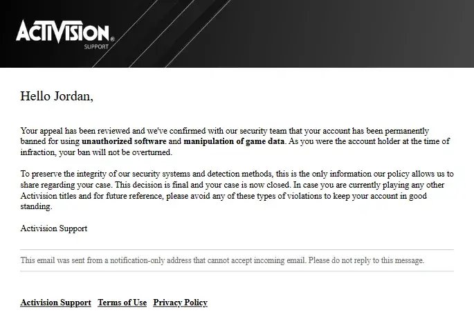 While I understand that Activision takes cheating seriously, I believe my ban appeal was unjustly rejected without proper investigation or consideration of my case.