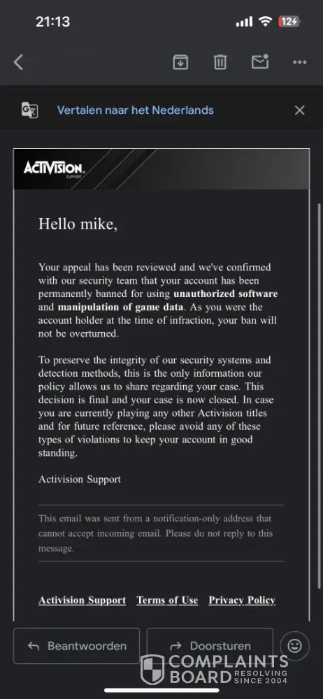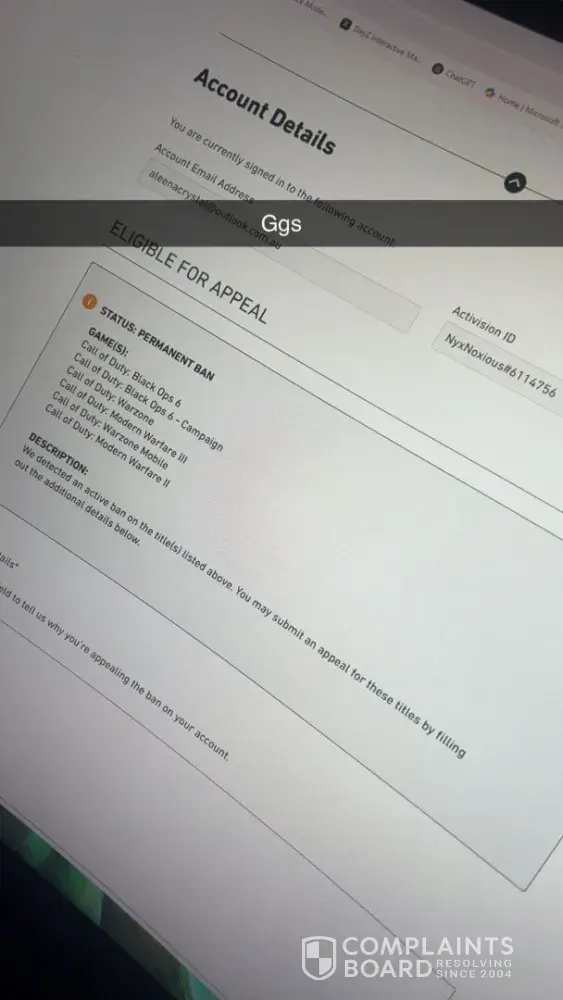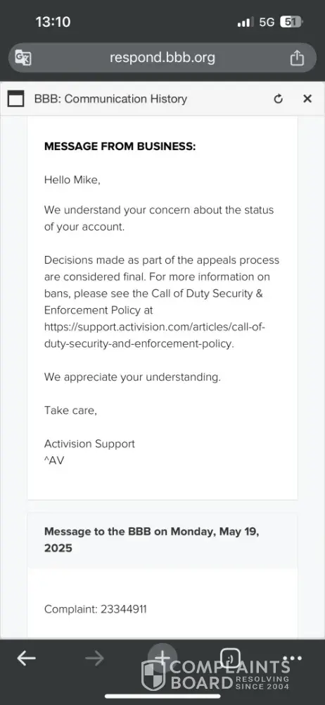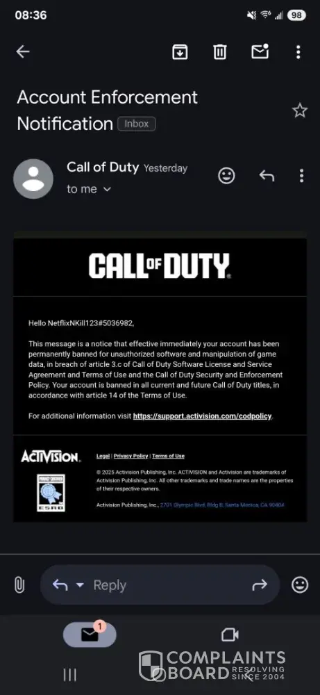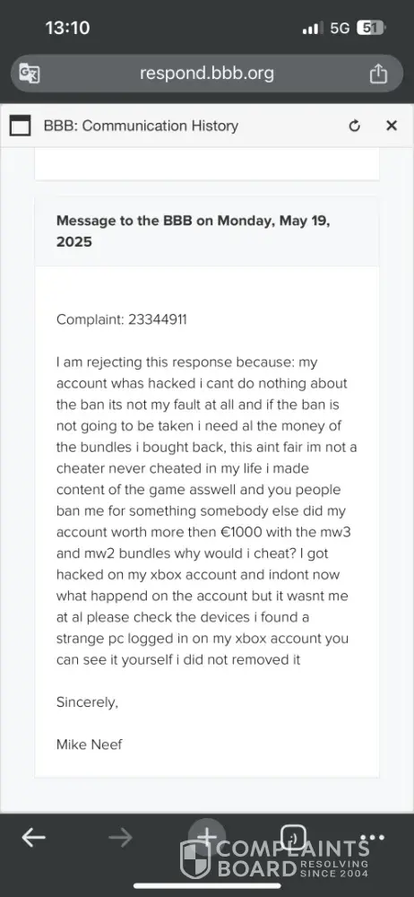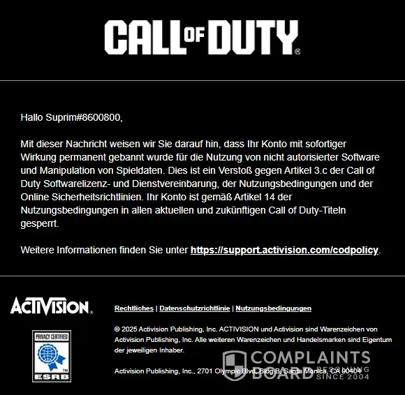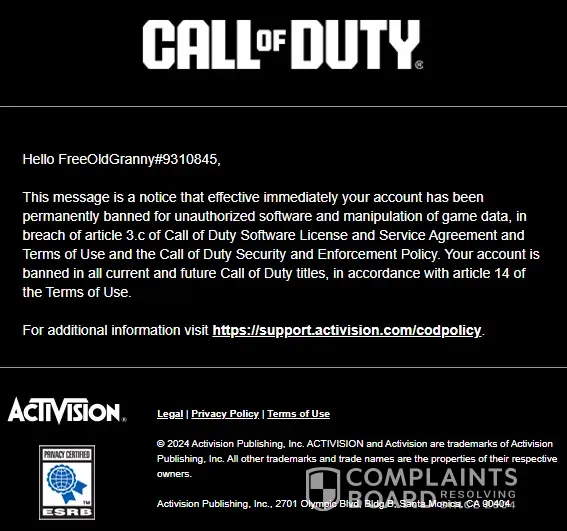 Formal Complaint Against Activision for Unjustified Account Bans and Lack of Support Response Dear Sir or Madam, I am writing to file a formal complaint against Activision Blizzard regarding the unfair and repeated bans of my Call of Duty accounts, as well as the complete lack of adequate response from their support team. My main account was permanently...