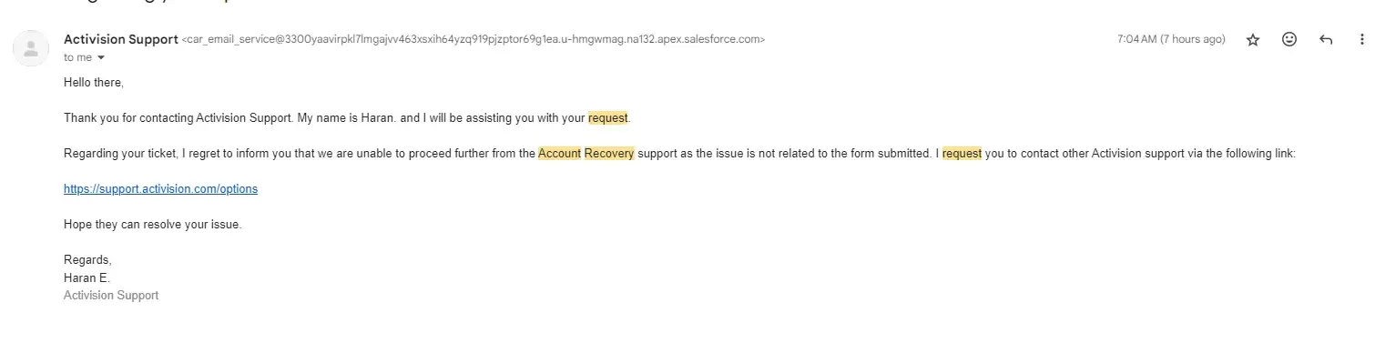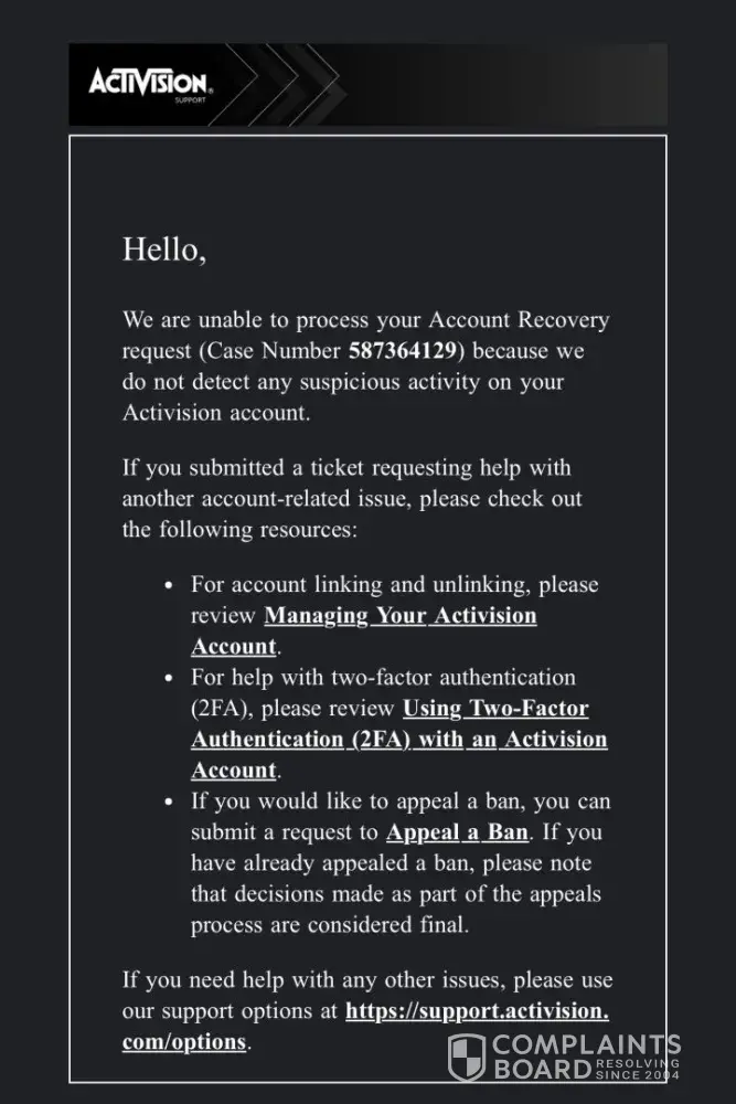 Activision account recovery case: [protected]