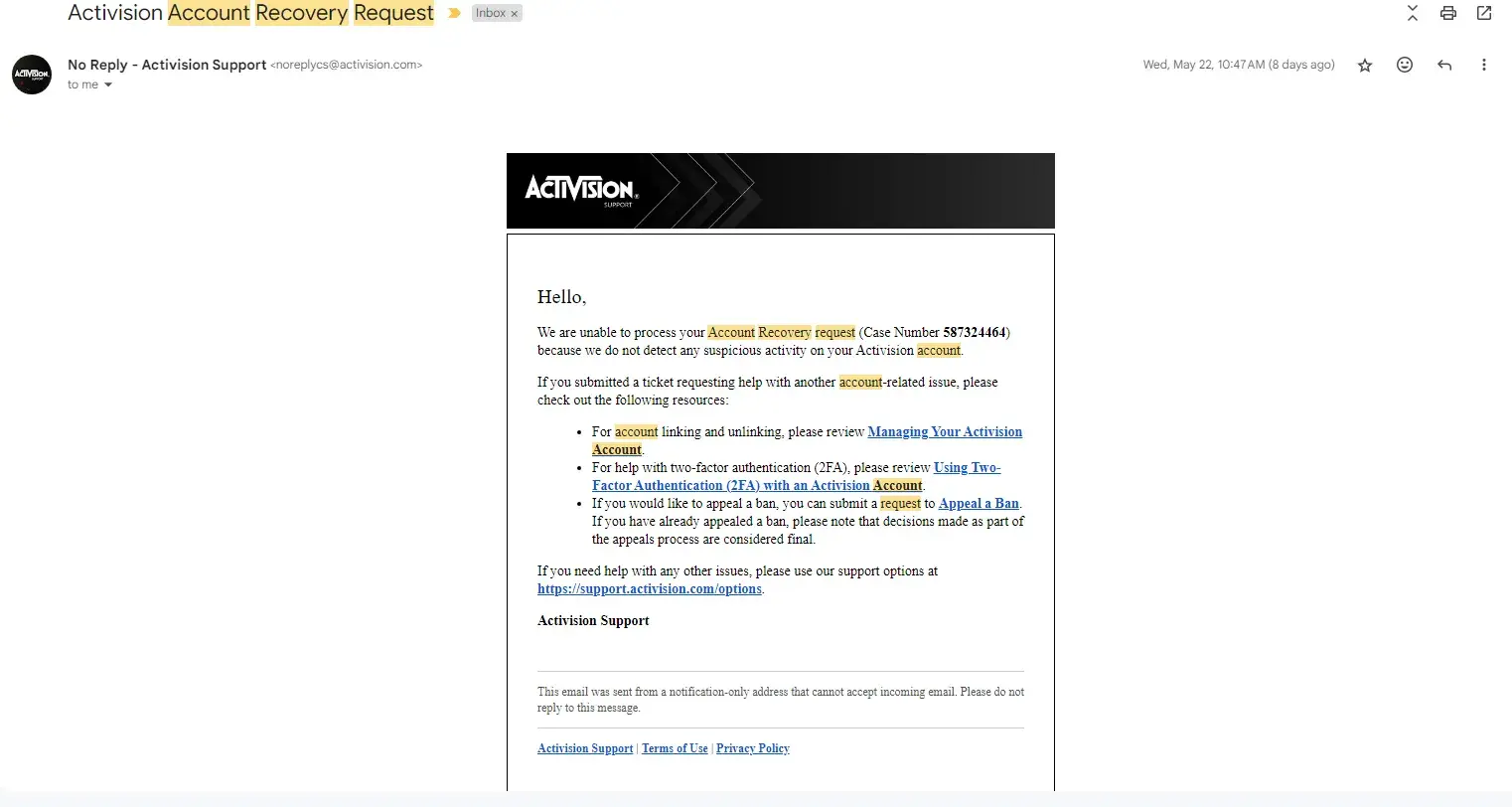 Activision Account Recovery Request ID: [protected]