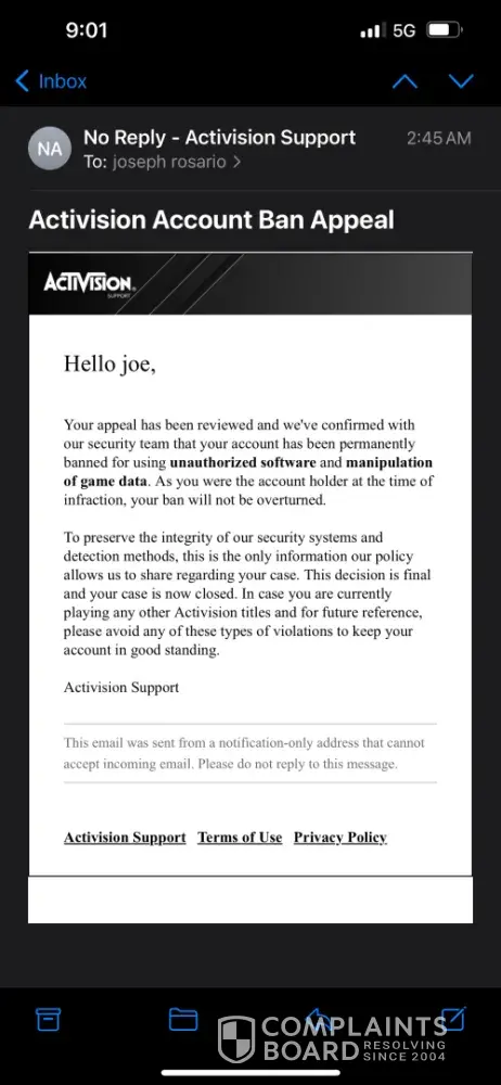 I reported through battle.net and activision that my account had been hacked in March 2024. I managed to recover my account by unlinking the steam account and email that the hacker tried to use. Following this, it appeared that I had been banned by Activision for violation of terms. Upon appeal, I recieved an email back to state that: "Your appeal ha...