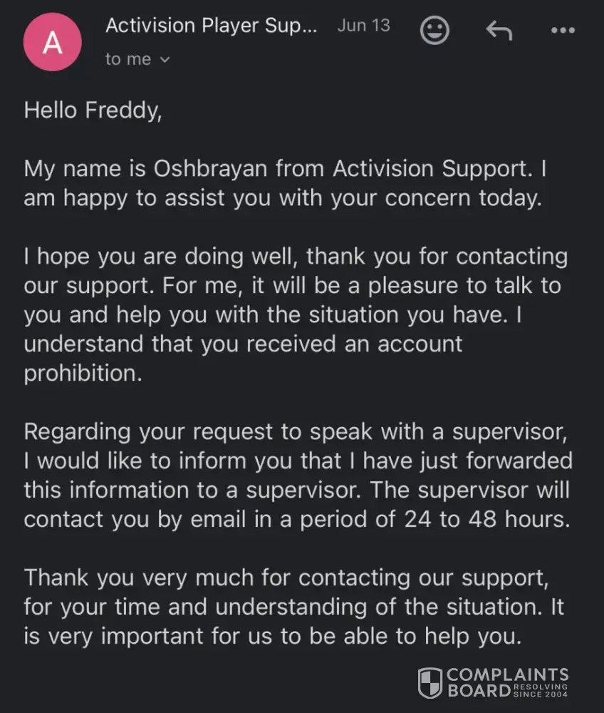 I am writing to request a review and resolution of the ban on my Call of Duty account. For the past four months, I have been in continuous communication with Activision support regarding this issue, but it has not yielded any results. My account was breached by a foreign Xbox account, which led to my ban. Following the instructions provided by the Activision support team, I took all the necessary steps to recover my account, including enabling two-factor authentication (2FA). Although I now have access to my account, the ban remains in place, and I am unable to unlink the foreign Xbox account. Every time I open a support ticket to address the ban and unlink the unauthorized Xbox account, I receive the same automated message stating that there is nothing wrong with my account. Despite my persistent efforts, this issue remains unresolved. Given these circumstances, I kindly request a supervisor to review my case and consider lifting the ban on my account. I have taken all necessary steps to secure my account and ensure such incidents do not recur. Thank you for your understanding and assistance.