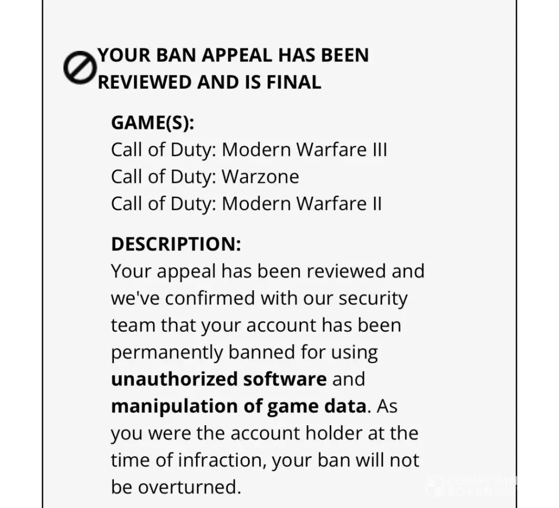 So I am currently permanently banned from a game I have never cheated on and never in any way manipulated the game data of. Activision support has been very unresponsive in this entire process. If there is any reason for me being banned under this condition it would be because I changed my account email from my fathers to my own, both containing my last name in it. Not to mention there is zero reasoning for me to be banned in MWII as I do not have it downloaded, if you would be able to provide me any clarity on this widely experienced issue it would be greatly appreciated.